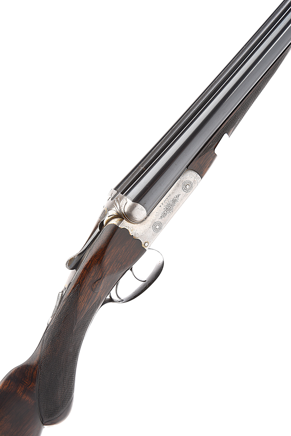 W.P. JONES 12-BORE BOXLOCK EJECTOR, serial no. 14808, circa 1915, 28in. nitro reproved barrels, tubes engraved 'W.P. JONES. PATENTEE. 25. WHITTALL BIRMINGHAM. WINNER AT THE "FIELD" TRIALS OF 12 16 & 20 BORE GUNS. LONDON.' (thin), 2 1/2in. chambers, bored approx. imp. cyl. and 1/2 choke, scroll-back treble-grip action with sideclips, carved stylised acanthus leaf fences, toplever gold-inlaid with the makers name, automatic safety with gold-inlaid 'SAFE' detail, partial scroll engraving, brushed finish, 14 3/4in. figured semi-pistolgrip stock including 3/8in. wooden extension, weight 6lb. 7oz., in a canvas and leather case