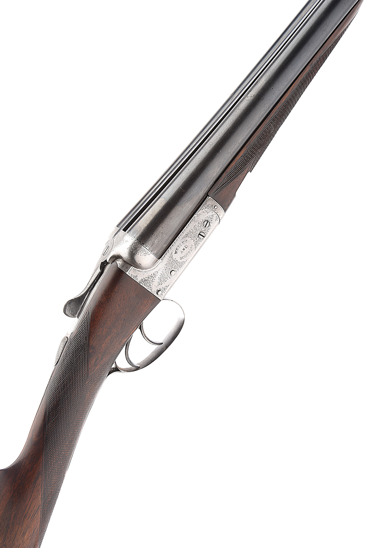 circa 1914, 26in. nitro barrels, the rib engraved 'MADE FOR ROBINSON & CO. SINGAPORE.', the tubes engraved 'WEBLEY & SCOTT LTD. LONDON & BIRMINGHAM.' (rubbed, faint), 2 1/2in. chambers, bored approx. 1/4 choke in both, treble-grip action, removable striker discs, automatic safety with gold-inlaid 'SAFE' detail, border and partial acanthus scroll engraving, bright finish, 14 1/2in. stock including buttplate, weight 6lb. 7oz.