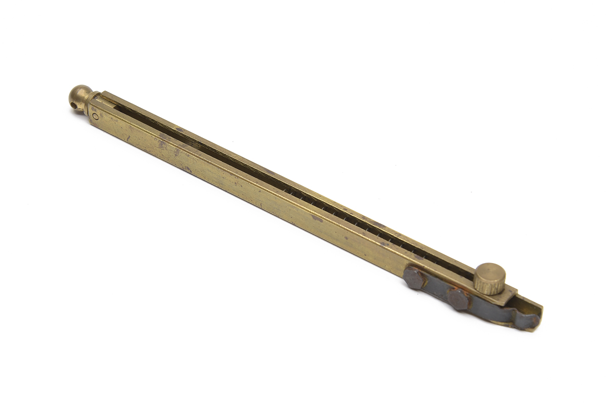 A RARE VINTAGE 'STRAIGHT LINE' CAPPER/PERCUSSION CAP DISPENSER, circa 1860s, brass with internal steel spring and steel spring clip, eyed top finial, unnamed, good clean condition with no dents, 5 1/2in.
