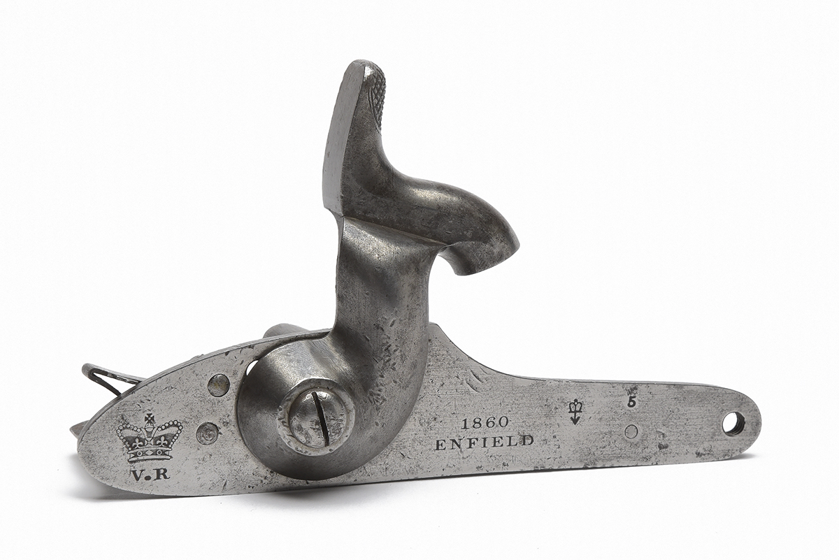 AN ORIGINAL MILITARY 'UNIVERSAL' ENFIELD PERCUSSION LOCK, dated 1860, with crown over 'V' R.', lock-keeper's mark and '5' to front, with many parts carrying Enfield inspection stamps and manufacturers' marks on reverse