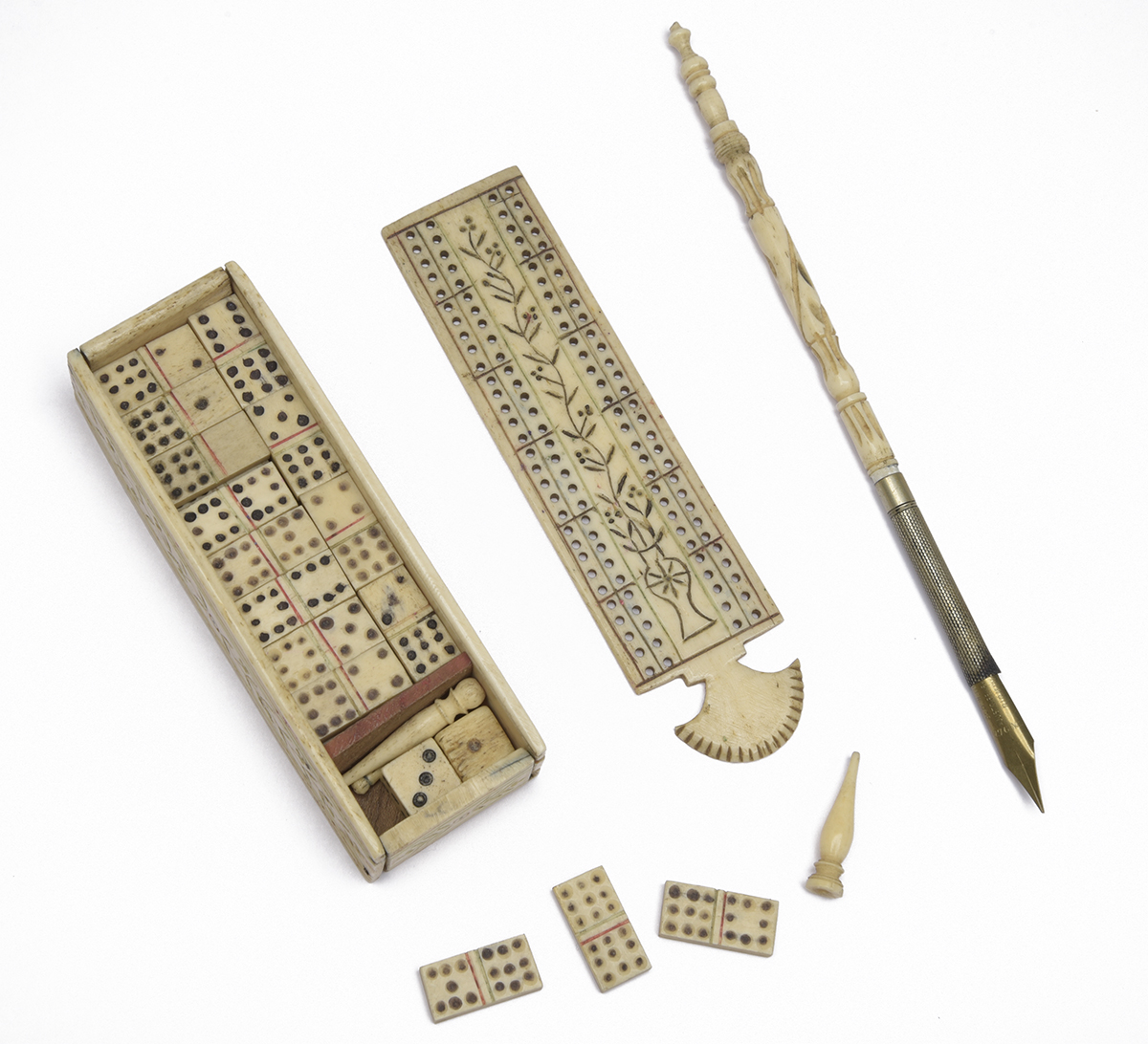 A RARE FRENCH NAPOLEONIC POW CARVED BONE BOXED SET OF DOMINOES, DICE AND DIP PEN, circa early 1800s, being a carved bone box with floral decoration and wooden base, the lid with shell finial and designed for scoring, containing a set of nine-spot bone dominoes (3 missing), three bone scoring pegs and two bone dice, together with a carved bone dip pen shaft with later Victorian grip and early 20th Century G. W. Hughes nib; these bone items were made for sale by French PoWs held in England to supplement their meagre rations, box including lid finial 5 1/2in., pen 7in. overall