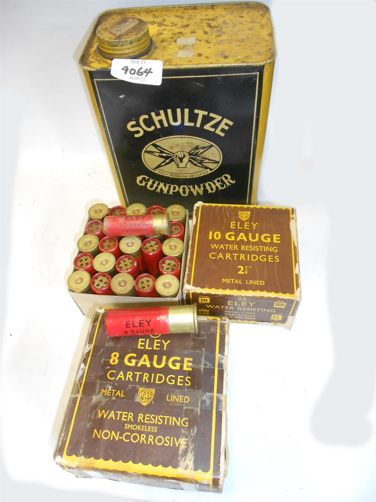 25 ELEY 8 BORE 3 1/4in, AAA SHOT WITH 25 ELEY 10 BORE 2 7/8in. 4 SHOT, ALL METAL LINED IN ORIGINAL CARTONS WITH A SCHULTZ TIN Please be advised that cartridges/ammunition, primers, primed cases, blanks and percussion caps cannot be sent to you by post or carrier. If you wish, you can book a collection at one of our regional valuation days, or collect from our offices at PE31 6HA in Norfolk