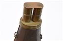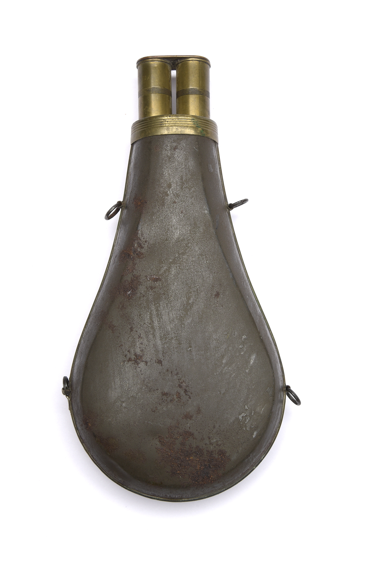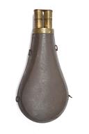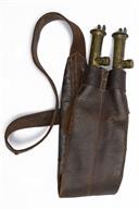 A MOST UNUSUAL TIN-BODIED TWIN-NOZZLE POWDER-FLASK TOGETHER WITH A DOUBLE LEATHER SHOT-BELT, the first of sporting gun size, with twin brass nozzles and double dispensing cap, the second of Irish form with automatic cut-offs