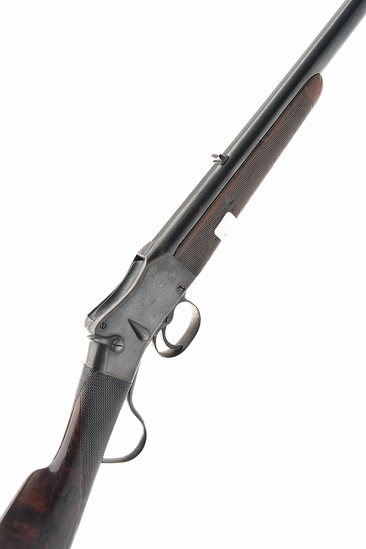J. HANSON .410 (SMOOTHBORED) MARTINI-ACTION RIFLE, serial no. 1608/ 17512, circa 1900, converted from .380 CF, 26 1/4in. ovoid barrel with matted sight flat slightly engraved 'J. HANSON. 244 HIGH ST. LINCOLN' (very faint, mostly illegible), dove-tailed blade fore-sight, notch rear-sight, Martini-action, border engraving, 14 1/4in. highly figured stock including steel buttplate,