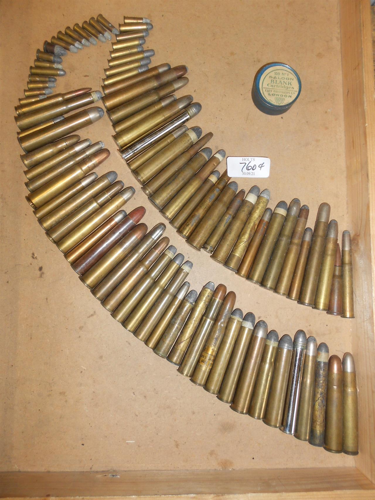 85 COLLECTABLE BIG GAME AND OLD TIMER AMMUNITION FROM YESTERYEAR WITH A TIN OF 20 SALOON .22, this LOT is comprised of mainly flanged big game cartridges, some Rook Rifle cartridges and other rare calibres.