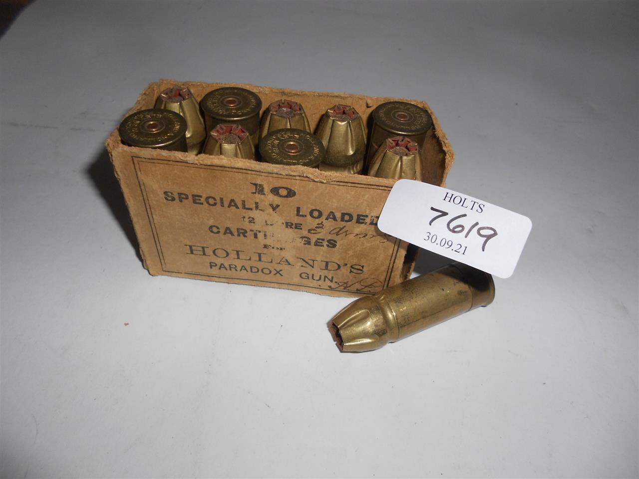 10 ROUNDS 12 BORE BRASS BASE STAMPED PARADOX AMMUNITION FOR HOLLANDS PARADOX GUN, IN ORIGINAL CARTON Please be advised that cartridges/ammunition, primers, primed cases, blanks and percussion caps cannot be sent to you by post or carrier. If you wish, you can book a collection at one of our regional valuation days, or collect from our offices at PE31 6HA in Norfolk