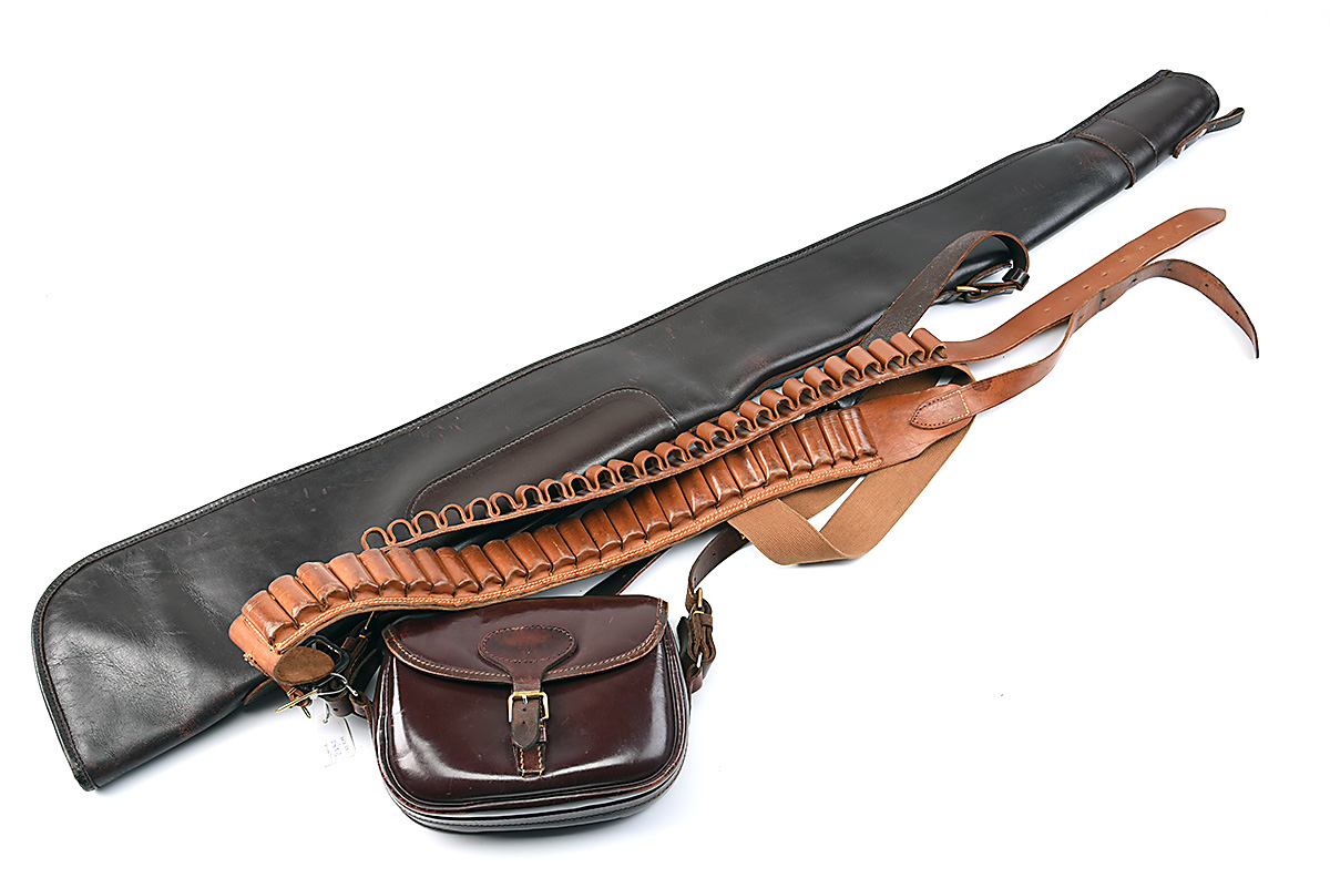 A COLLECTION OF SHOOTING ACCESSORIES, comprising of a leather fleece-lined single gunslip, a leather cartridge belt, 2 x cartridge belts