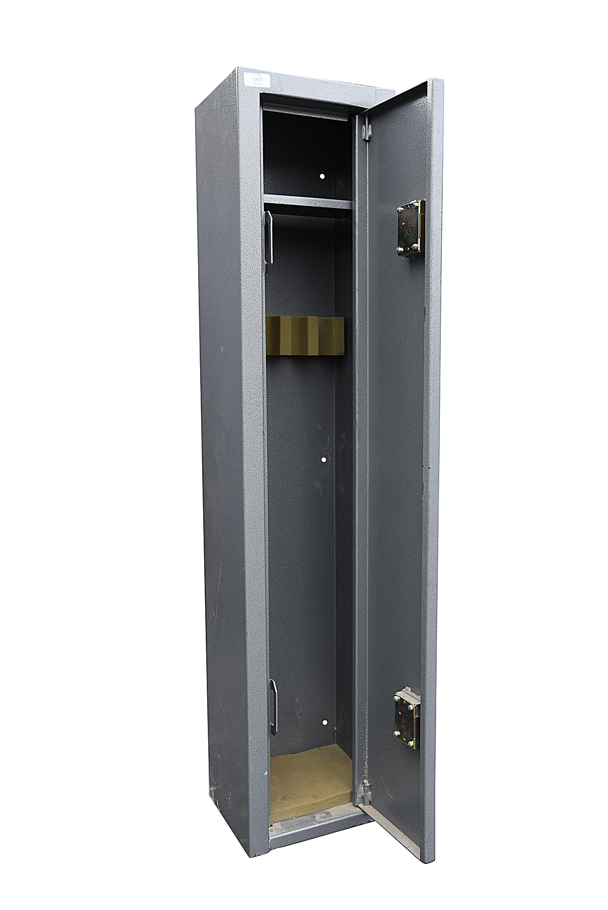 A STEEL GUN CABINET, fitted for 4 x guns, 2 x locks (including keys, measuring approx. 54in. x 12in. x 9 1/2in.