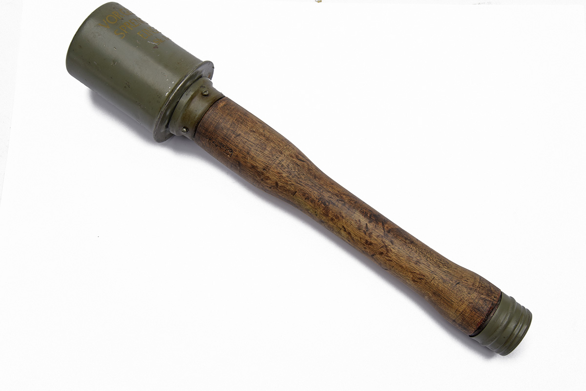 A GERMAN WW2 INERT STICK-GRENADE, dated for 1939 with wood handle, beaded fuze string (head cross-threaded) otherwise good condition
