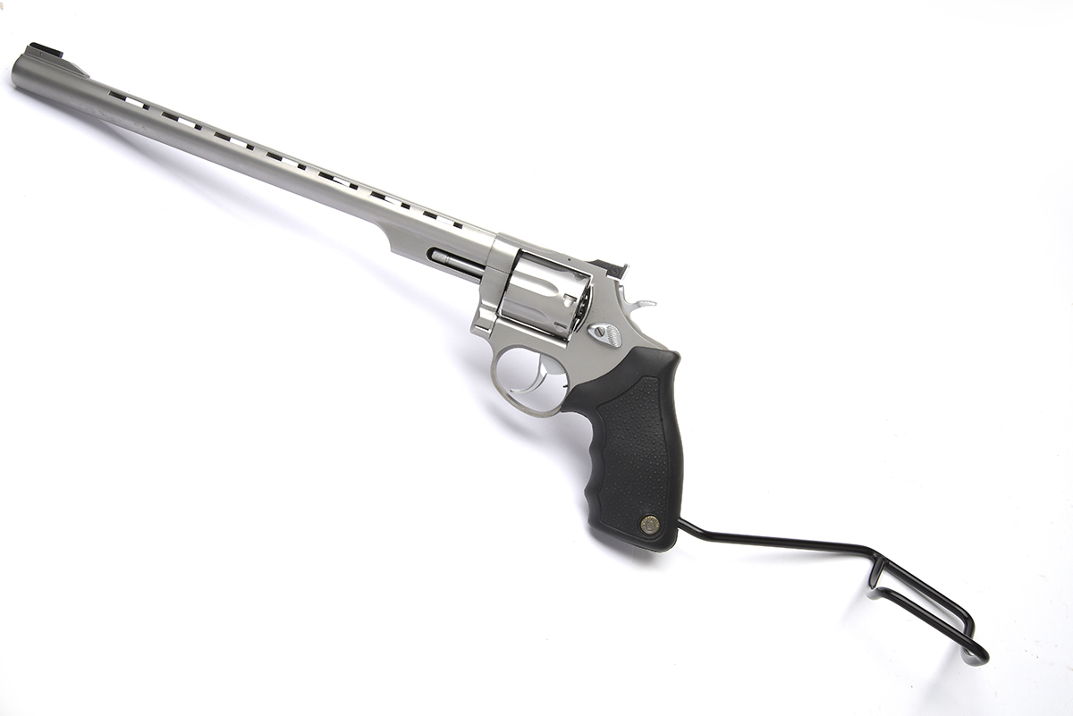 A .357 MAGNUM LONG BARRELLED REVOLVER SIGNED TAURUS, serial no. IU168115 with a 12in. stainless barrel, (bulged approx 4in. from front of cylinder), swing-out fluted cylinder and soft rubber grips, fitted with wrist brace for UK market