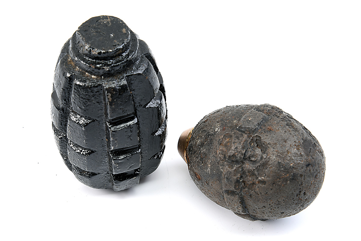TWO INERT HAND GRENADES the first a German WW1 'egg' grenade (excavated condition) with reproduction transit-plug, the second a Russian Type 42 practice grenade