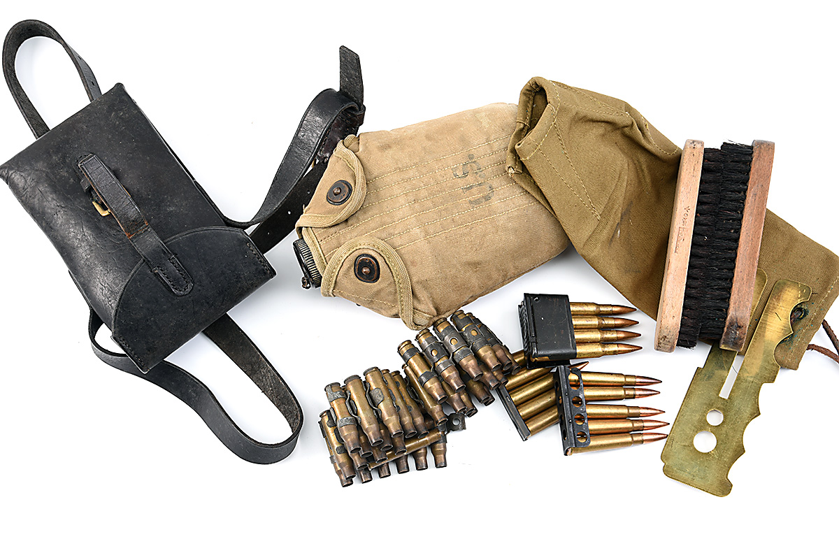 A BOX OF ASSORTED MILITARIA including a WW2 U.S. canteen and cover, a breech-cover for a No4 Enfield, issue clothes or boot brushes, some clips of inert rounds and a length of 7.62 disintegrating link, together with a leather pouched cleaning kit, possibly for an MP34 Steyr