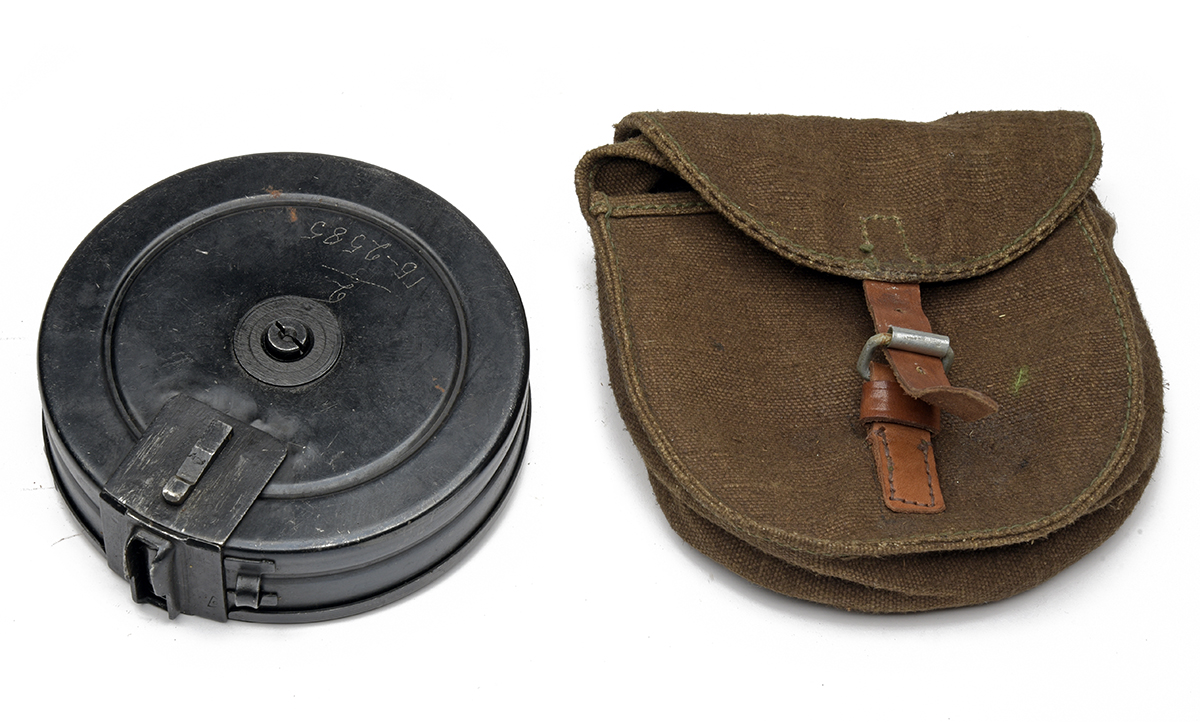 A DRUM MAGAZINE FOR A RUSSIAN PPSH SUB MACHINEGUN good condition complete with issue webbing pouch