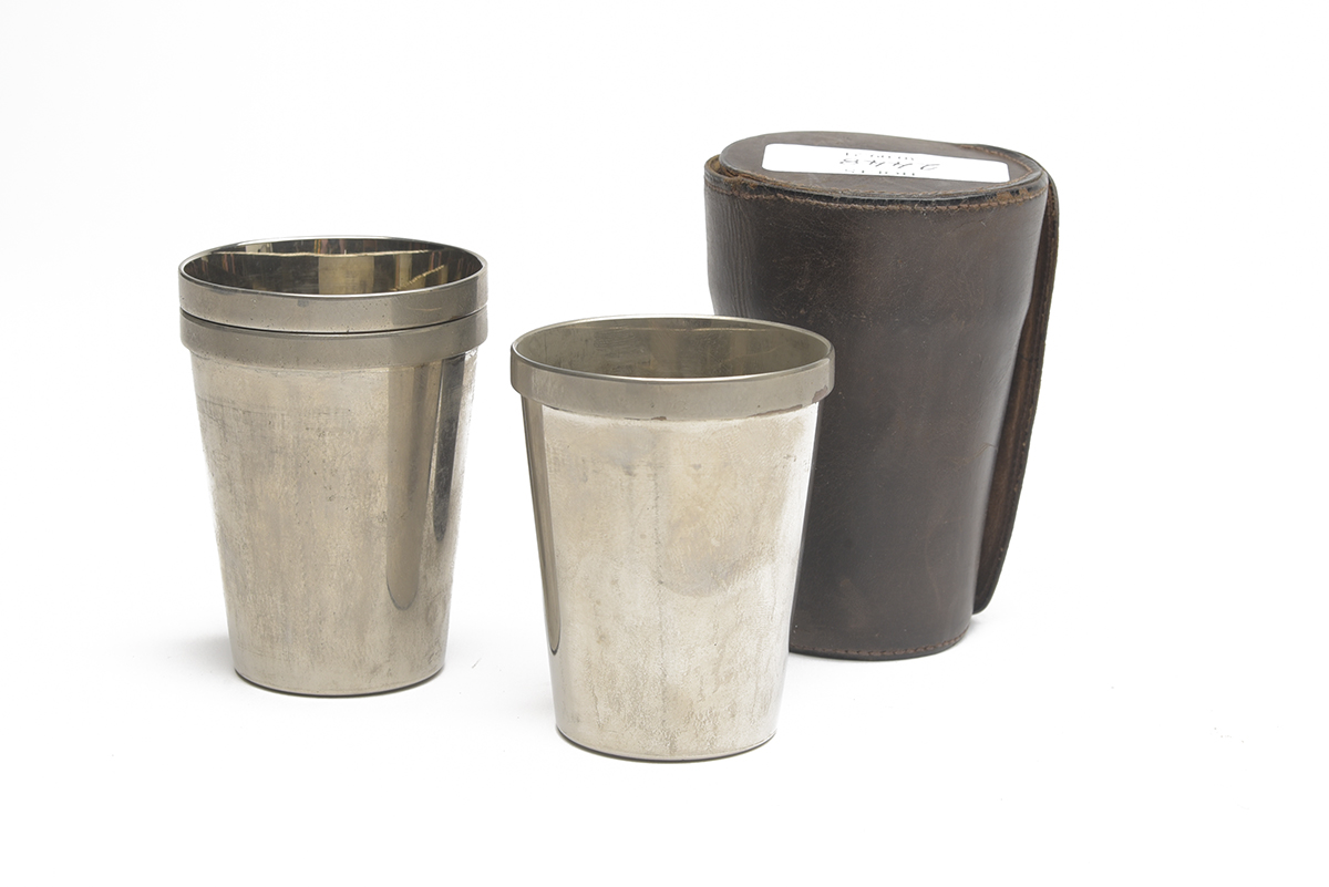 A LEATHER CASED TRIO OF VINTAGE TOT-CUPS each measuring approximately 2 3/4in. high, in the truncated conical leather case with press-stud closure