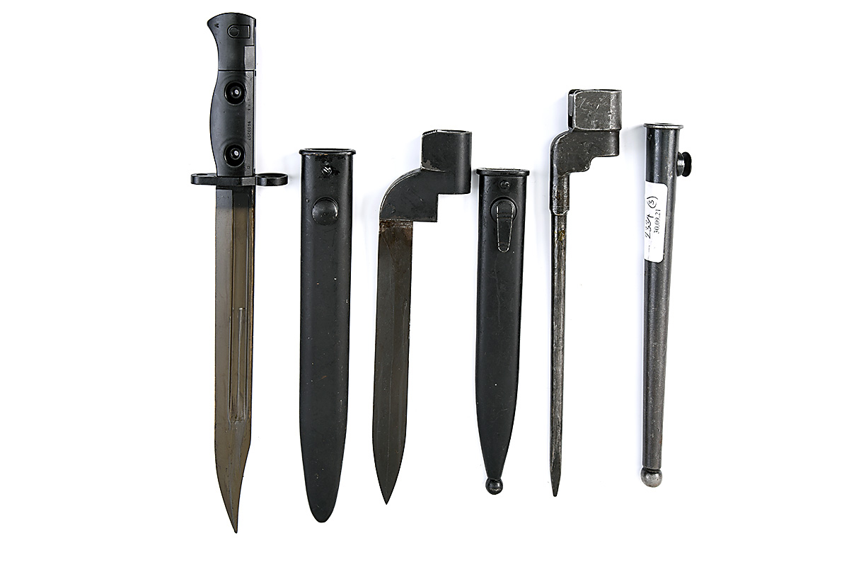 THREE BRITISH BAYONETS including an example for the SLR, another for the No4 rifle with bowie blade and the last a spike bayonet for same, all with scabbards
