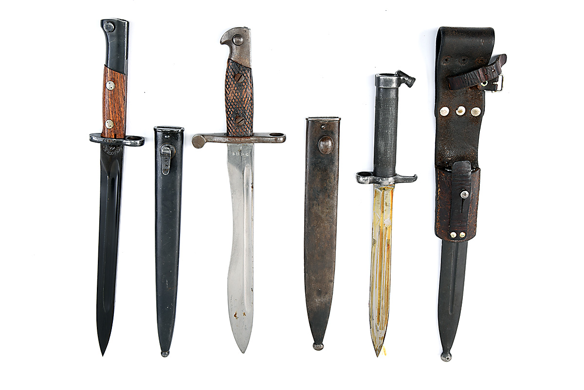 THREE CONTRACT MAUSER BAYONETS, including a Spanish Bolo, a Swedish Mauser and a Yugoslav Mauser, all with scabbards in good condition