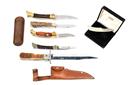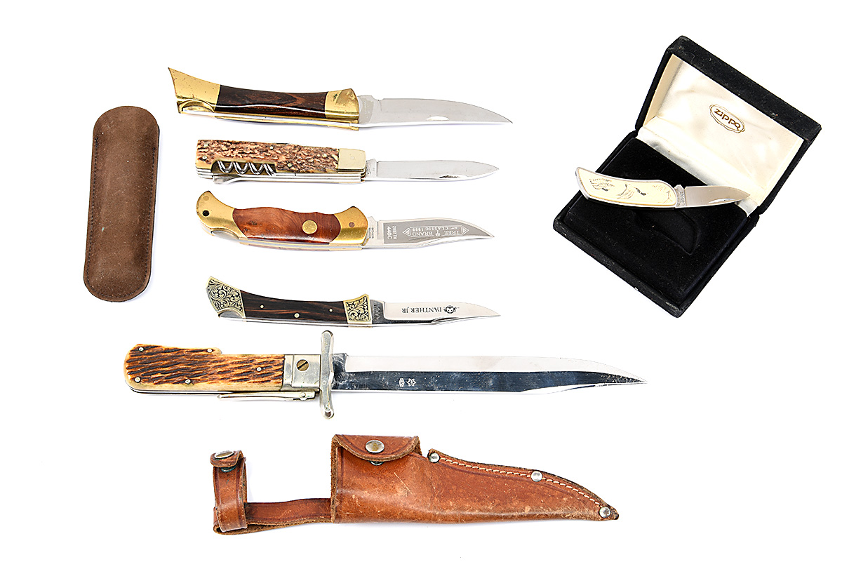 A GROUP OF SIX ASSORTED LOCK-KNIVES including a multi-bladed example signed 'Triodor', a folding bowie, a Boker 'Treebrand', a boxed promotional penknife signed 'Zippo', a Browning lock-knife and an etched example signed 'Panther'