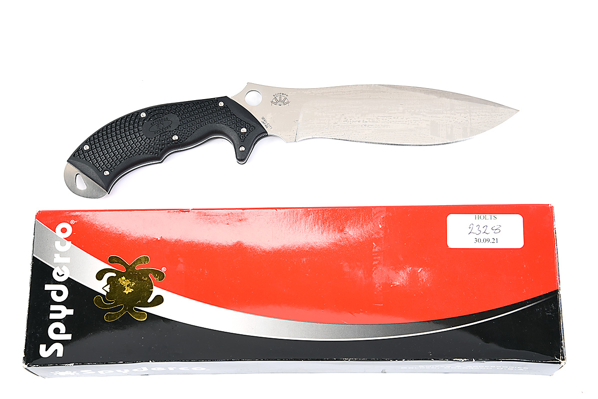 A BOXED NEW & UNUSED SHEATH-KNIFE SIGNED SPYDERCO, MODEL 'SCHEMPP ROCK', with drop-point 7in. blade, 'Zytel' handle, 'Zytel' sheath, in its maker's card carton with paperwork
