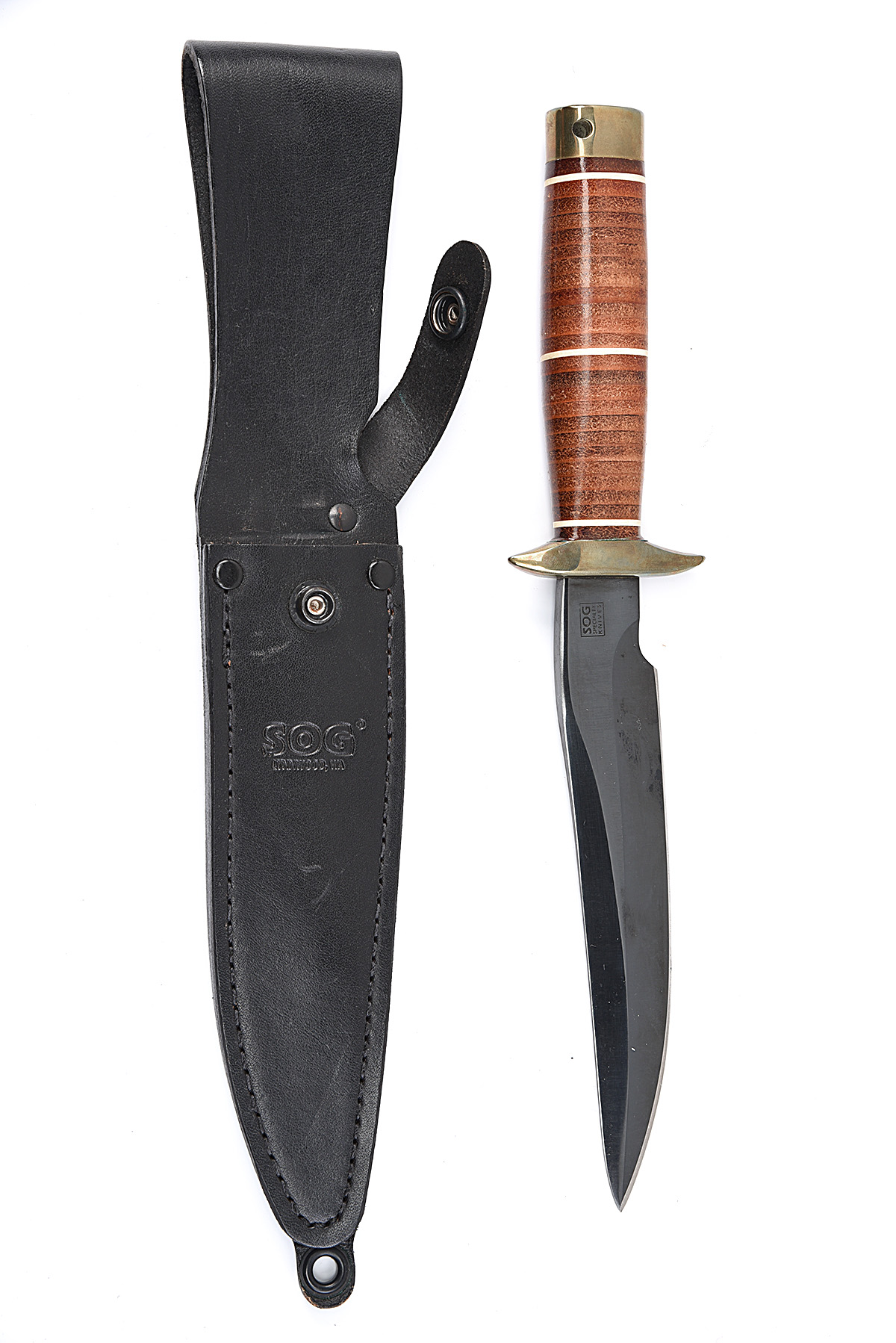 A BOXED BOWIE-KNIFE SIGNED SOG, MODEL 'RECON BOWIE', with blacked 6 1/2in. blade, brass furniture and leather handle, complete with its makers scabbard appearing unused but with light storage marks and box worn