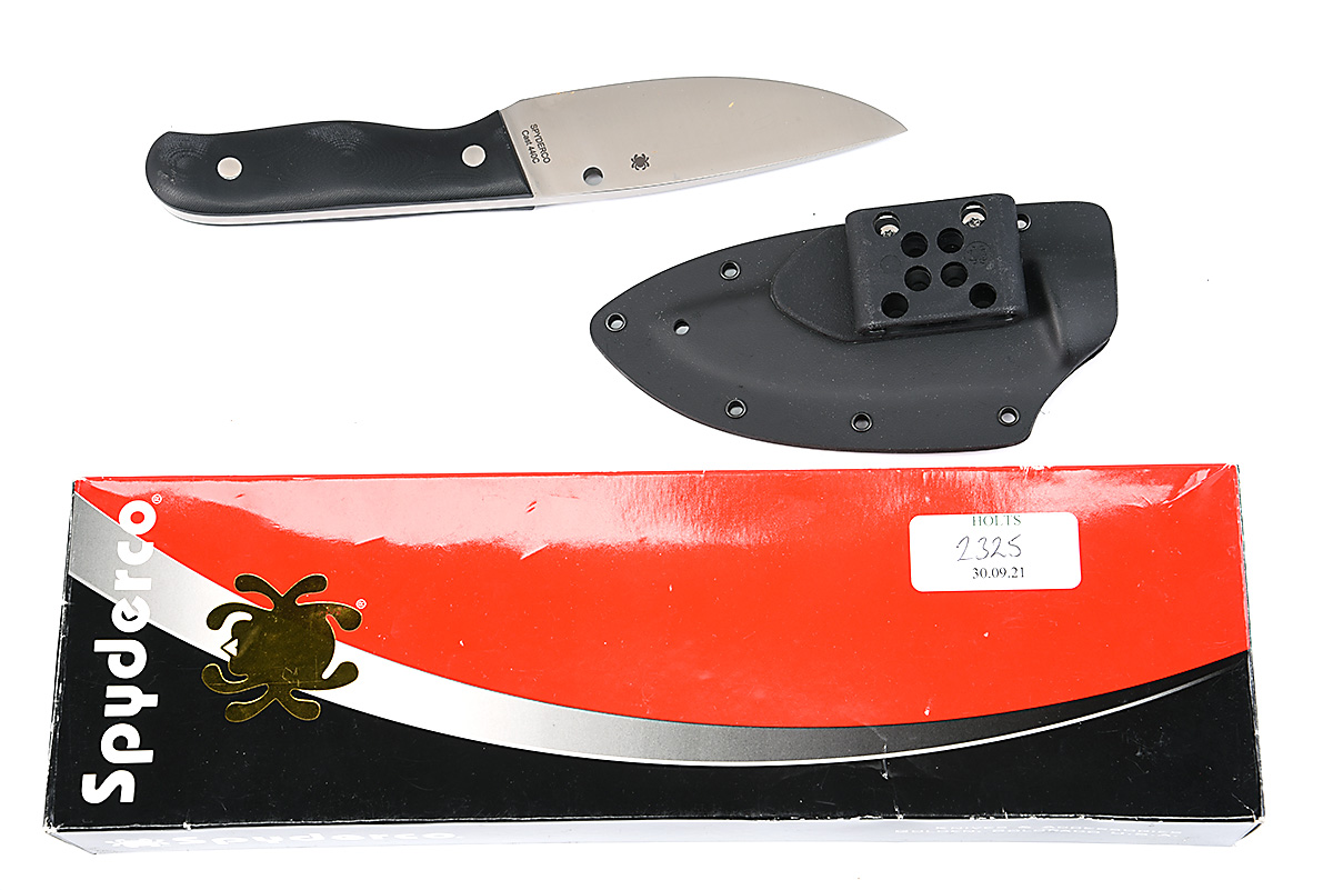 A BOXED NEW AND UNUSED SHEATH-KNIFE SIGNED SPYDERCO, MODEL 'SERRATA G10 PLN' with drop-point 4 1/2in. broad blade, micarta hilt and zytel scabbard, in its makers card carton
