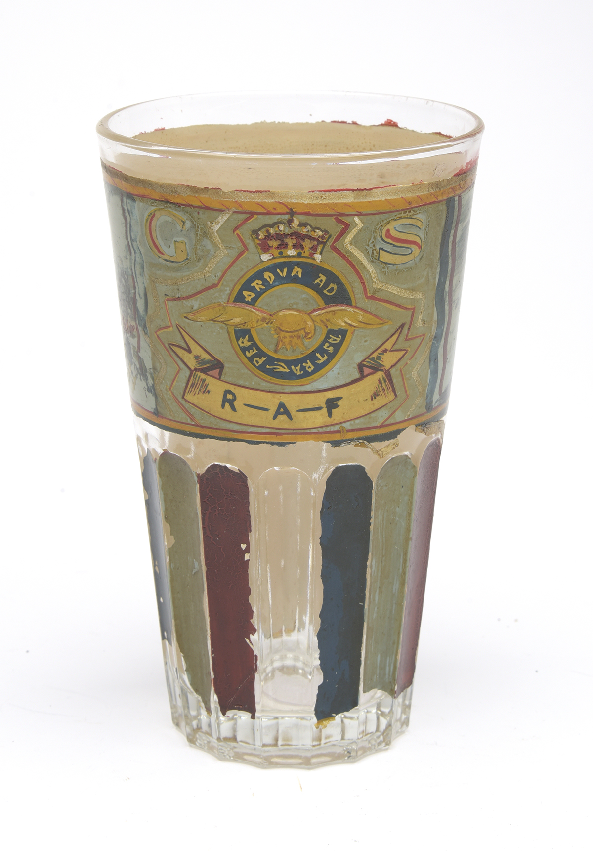 AN INTERESTING PAINTED GLASS TUMBLER, believed World War Two, 6in. high with fluted lower half, each flute painted either red, white or blue (white discoloured), the top half plain and hand-painted with a realistic depiction of a Mosquito aircraft in flight together with the legend 'MOSSY:-BERLIN' and signed 'PADDY CAV', the opposite side with the Royal Air Force crest and motto surmounted with a king's crown above a banner marked 'R-A-F', small amount of paint loss, generally very good.