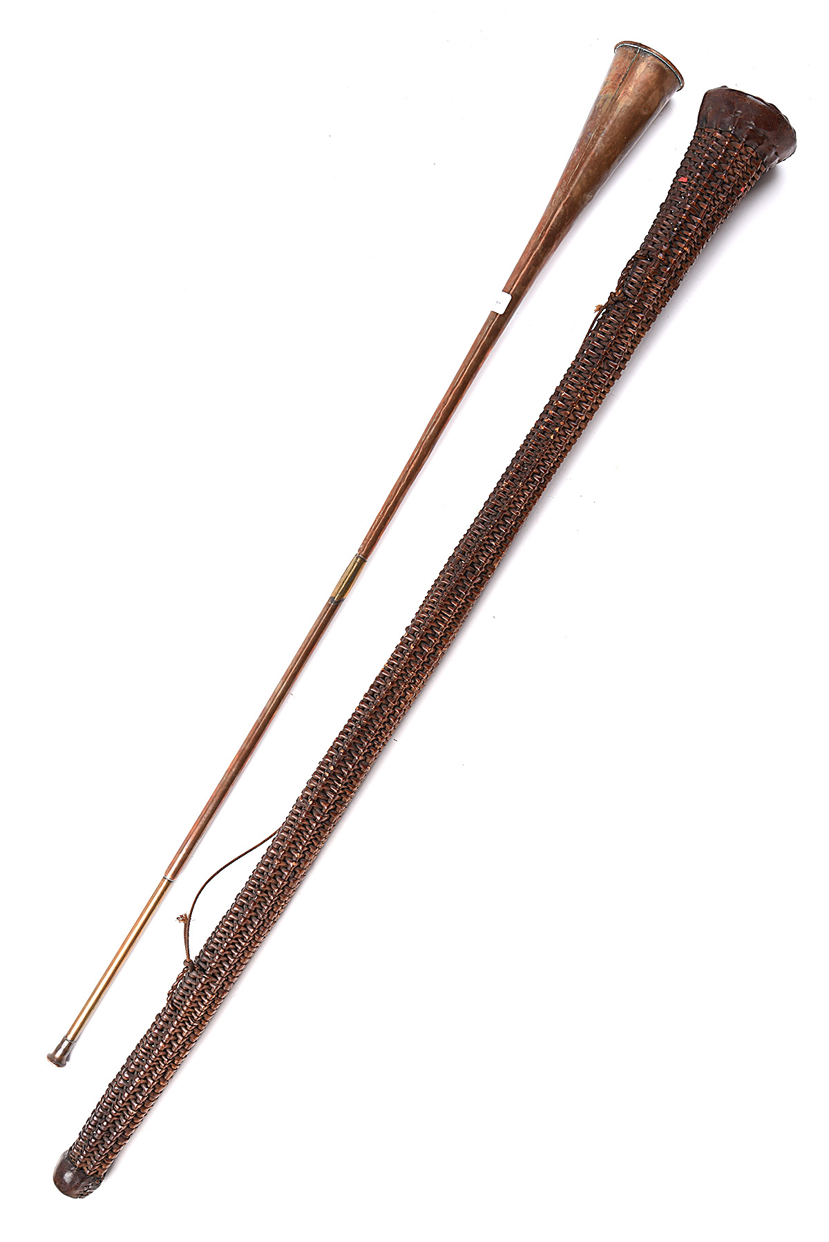 AN EARLY TO MID 19th CENTURY COACHING HORN, POSSIBLY ROYAL MAIL, 46 1/2in. overall, of copper with central plated brass repair, rolled flared trumpet marked 'LONDON No7 OXFORD', long brass mouth-piece tube with copper mouthpiece and complete with its wicker basket protector with leather reinforced opening