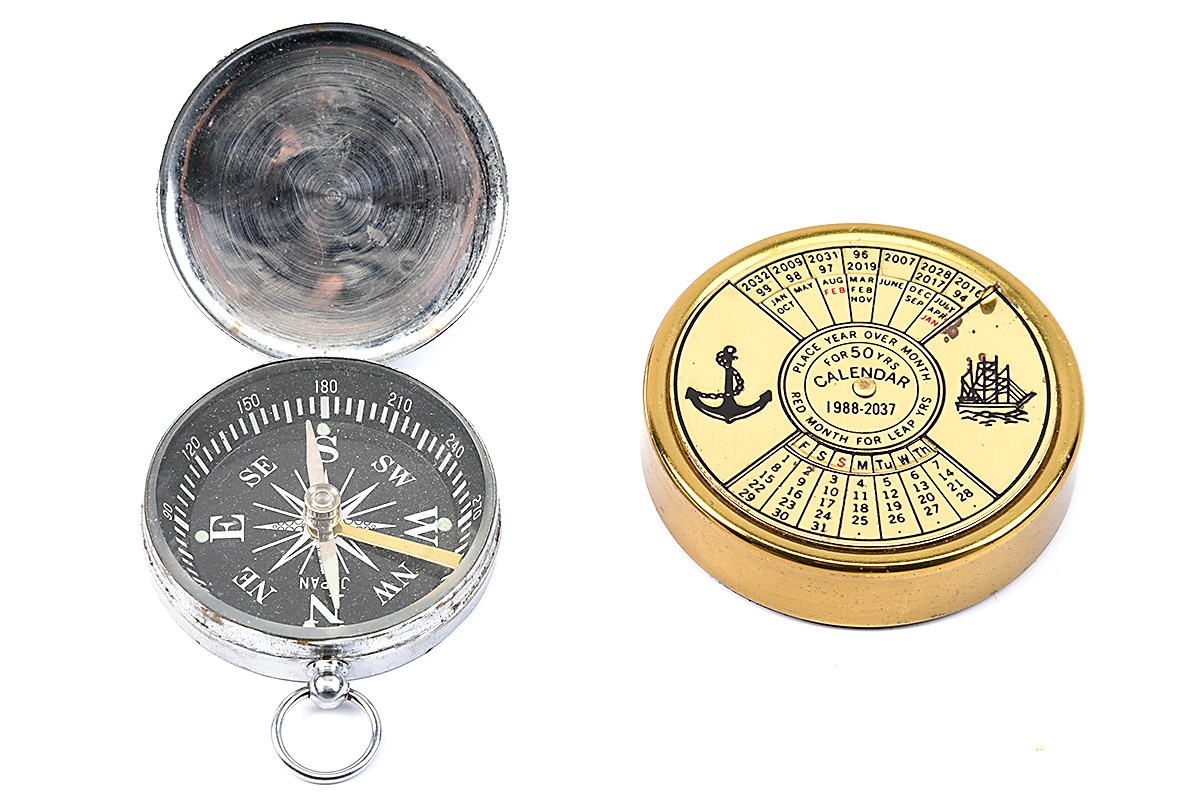 A PAIR OF NAUTICAL DEVICES, Comprising of a nickel plated Japanese compass, with a brass dial calendar for 50 years, 1988-2037.