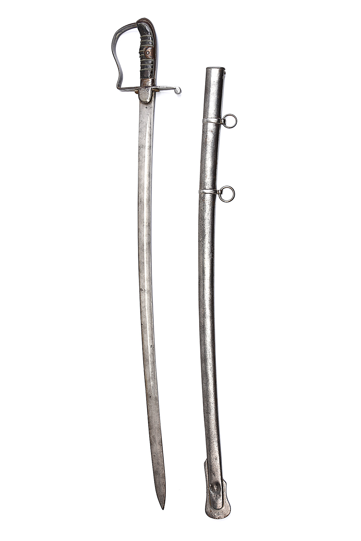 A PATTERN 1796 STYLE LIGHT CAVALRY SWORD, circa mid 19th Century with 33 3/4in. slightly curved, single edged blade fullered to each side, steel hilt, cross-guard with langets both sides, bowed knuckle-guard, leather covered grip bound with white metal wire, steel scabbard with two suspension rings, Farsi script to the drag represents the only markings seen, blade stained, grip-wire loose, chape dented and drag with surface rust, 40 1/2in. overall
