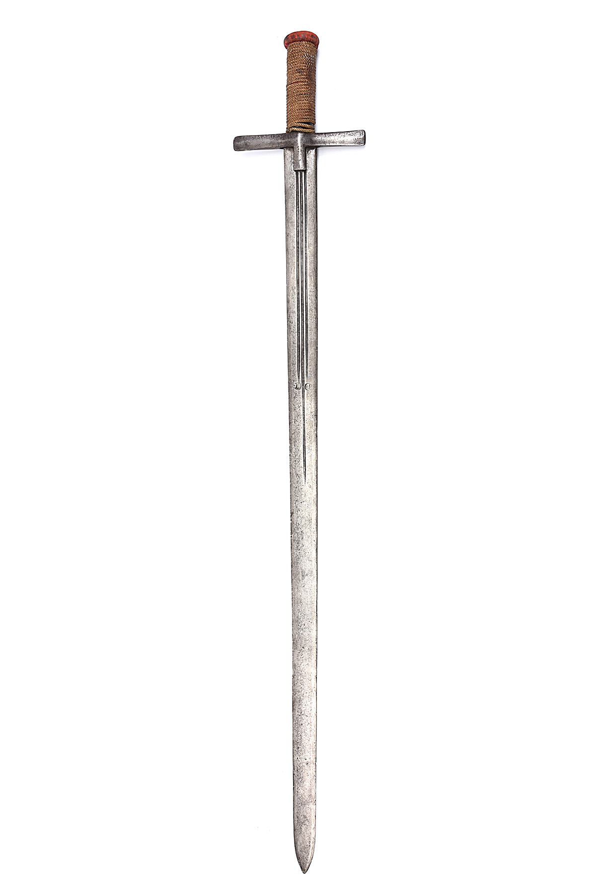 A TUAREG TABOUKA BROAD-SWORD, circa late 19th Century, with 35in. double-edged steel blade with two short and one longer fuller plus two half-moon symbols to each side, steel cross-guard, string-bound grip, red leather covered pommel, blade stained with significant edge-nicks, no scabbard, 39 1/4in. overall