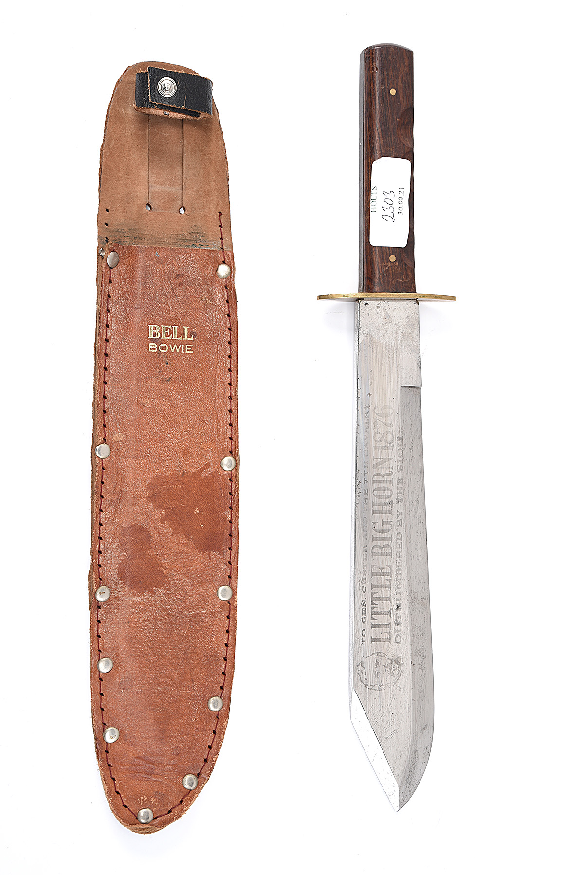 A 7TH CAVALRY COMMEMORATIVE BOWIE SIGNED BELL, with bright 10 1/2in. blade etched 'TO GEN CUSTER AND THE 7TH CAVALRY, LITTLE BIG HORN 1876, OUTNUMBERED BY THE SIOUX', brass boat-shaped cross-guard and slab-sided finger-grooved walnut grips, with a leather scabbard