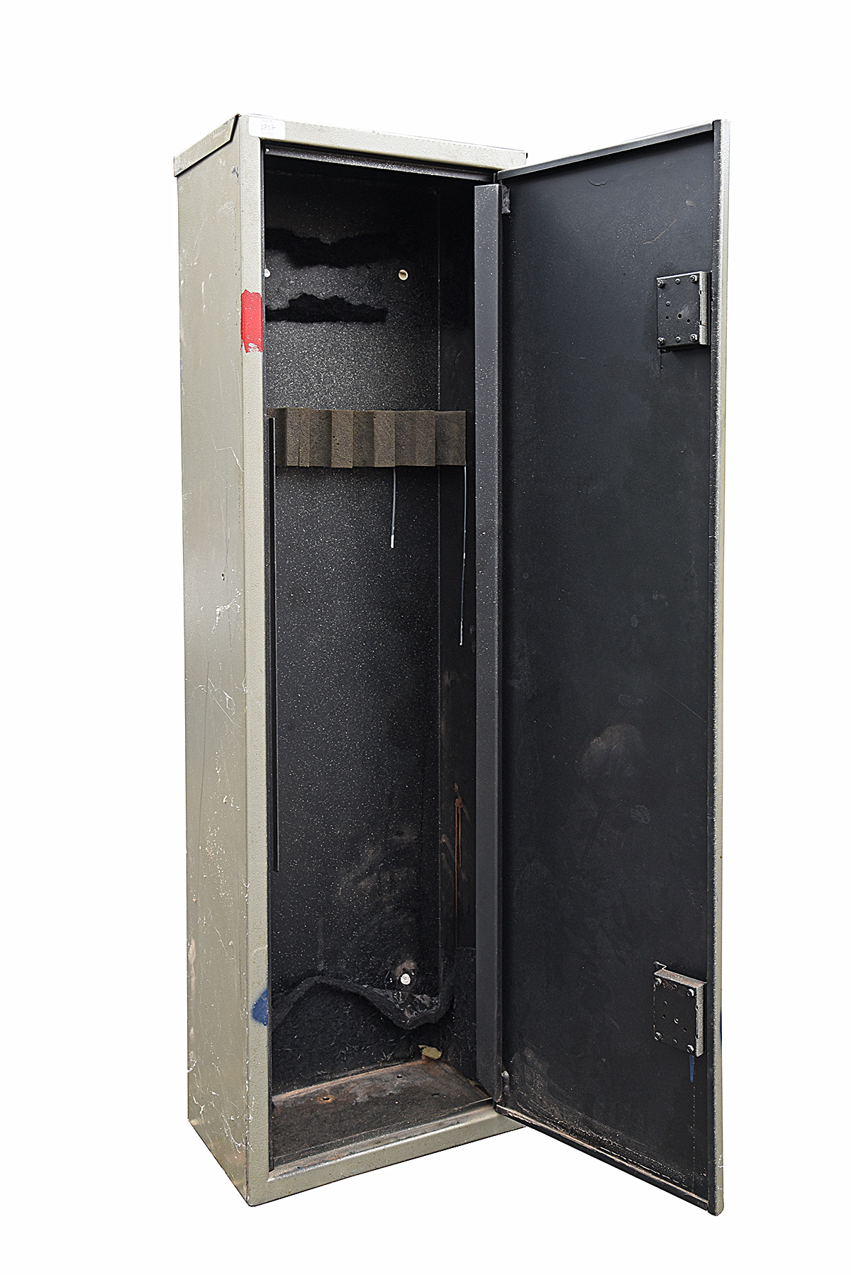 A STEEL GUN CABINET, for approx 5-6 guns, 2 x locks (including keys) measuring approx. 51 1/2in. x 16in. x 9 1/2in.
