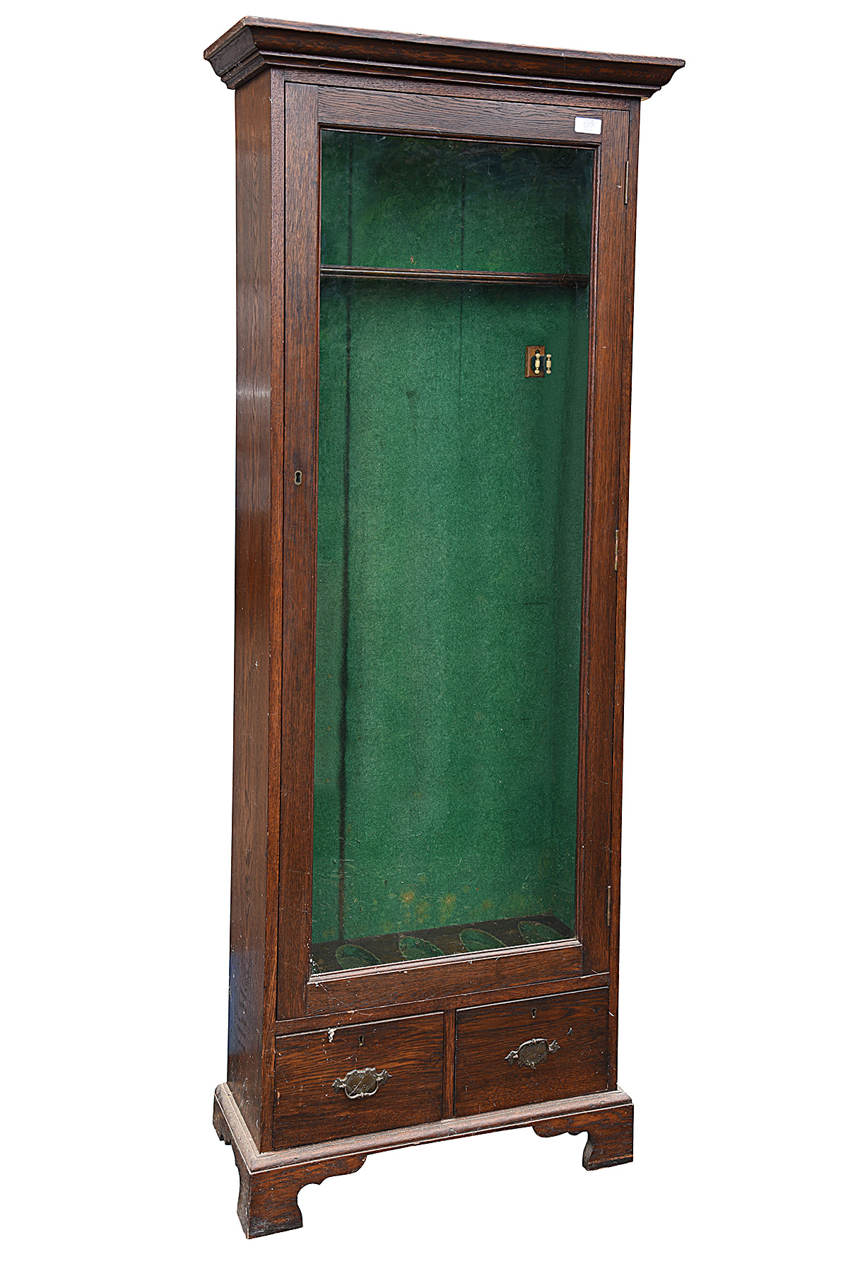 A VINTAGE TYPE GLAZED GUN DISPLAY CABINET, fitted for 5 x guns, glass front, measuring approx. 69in. x 29in. x 12in., bottom needs a little attention