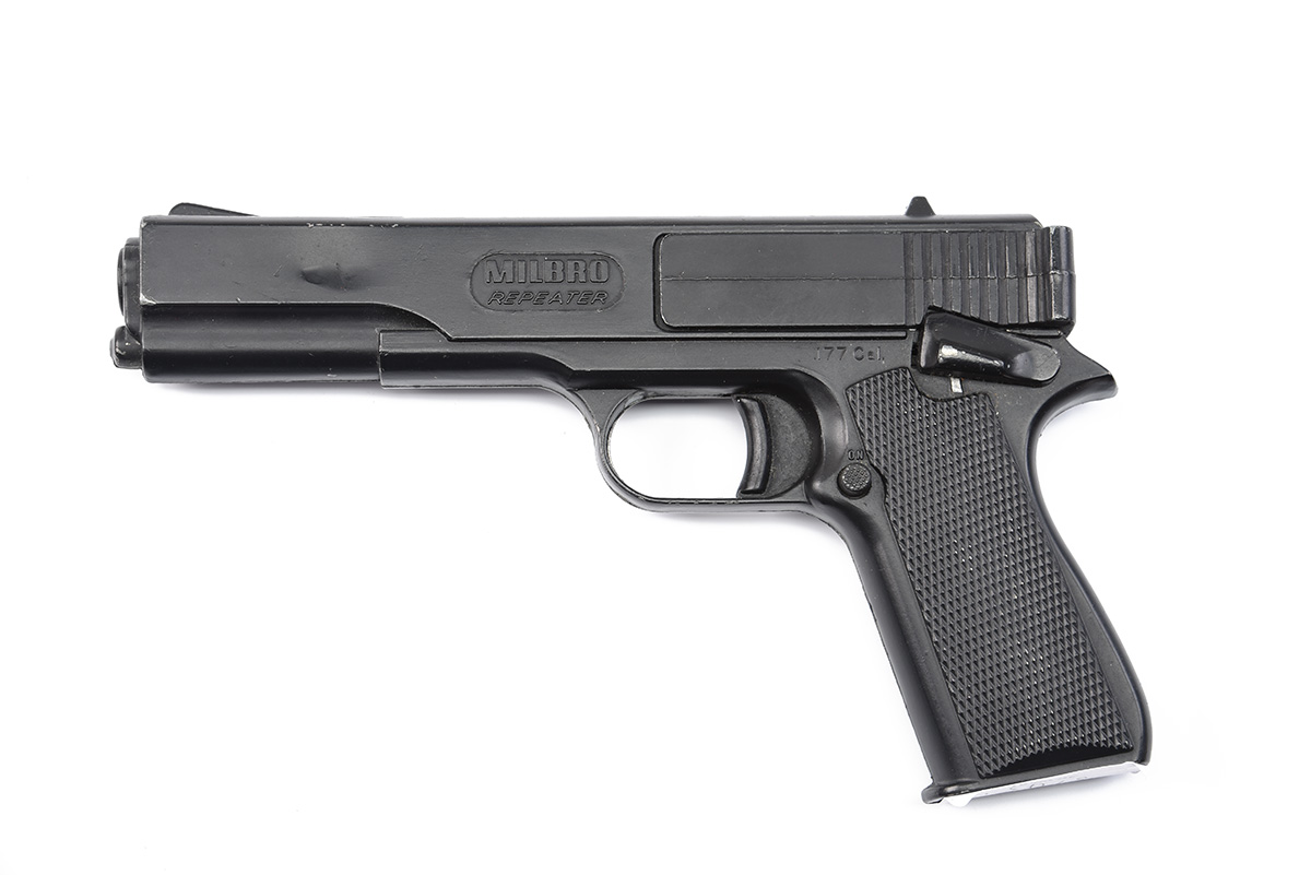 A BOXED .177 BB TOP SLIDE COCKING AIR-PISTOL SIGNED MILBRO, MODEL G10 no visible serial number,
