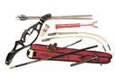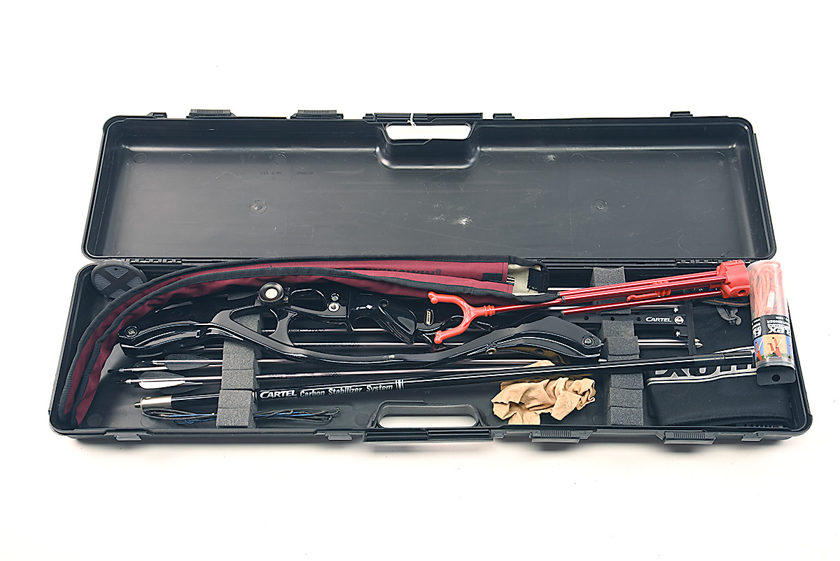 A RIGHT-HANDED POYT ECLIPSE RECURVE BOW, with Samick privilege limbs, 28Ibs., 68in. 12 x eastern platinum arrows, sight stablisers, cased