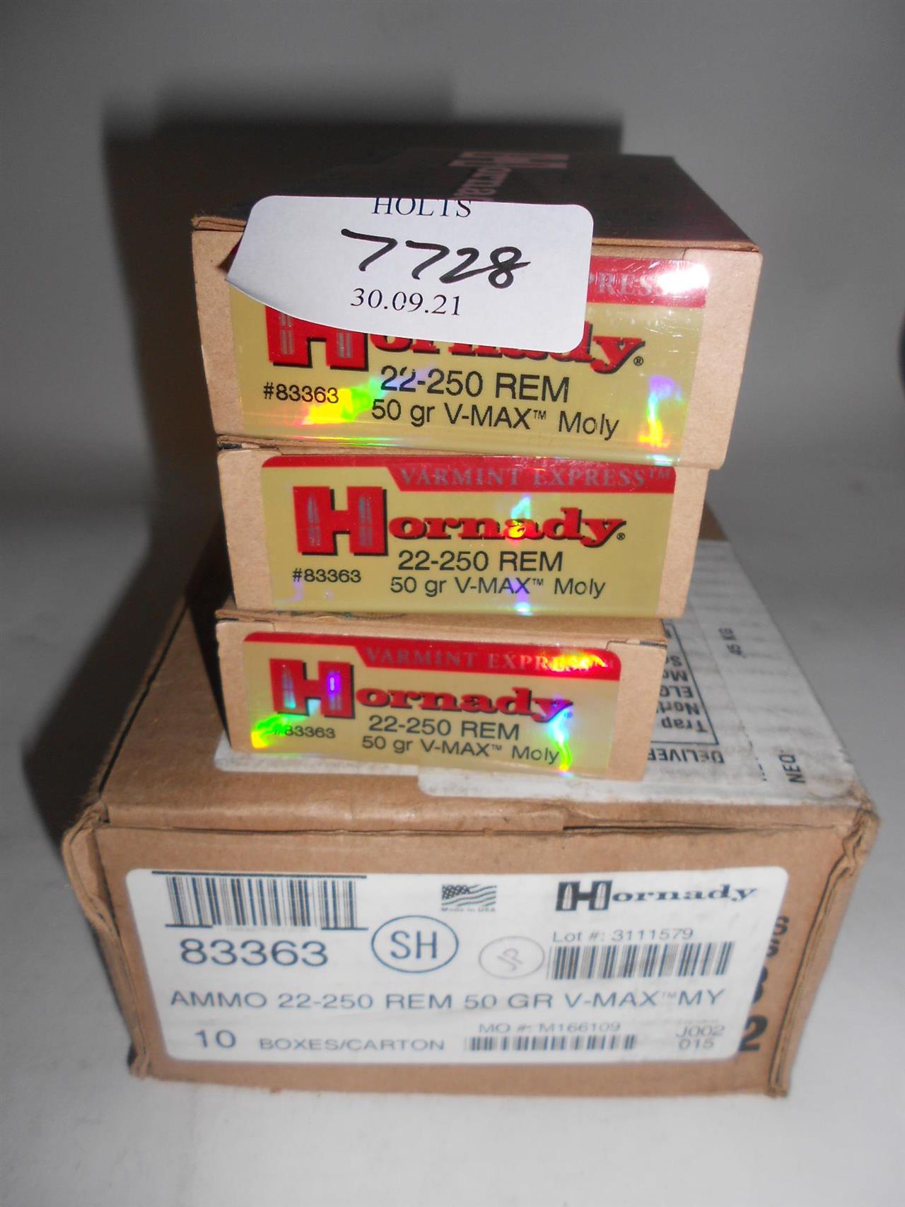230 ROUNDS 22-250 REM AMMUNITION BY HORNADY, 50grn V-MAX MOLY #83363 Please be advised that cartridges/ammunition, primers, primed cases, blanks and percussion caps cannot be sent to you by post or carrier. If you wish, you can book a collection at one of our regional valuation days, or collect from our offices at PE31 6HA in Norfolk