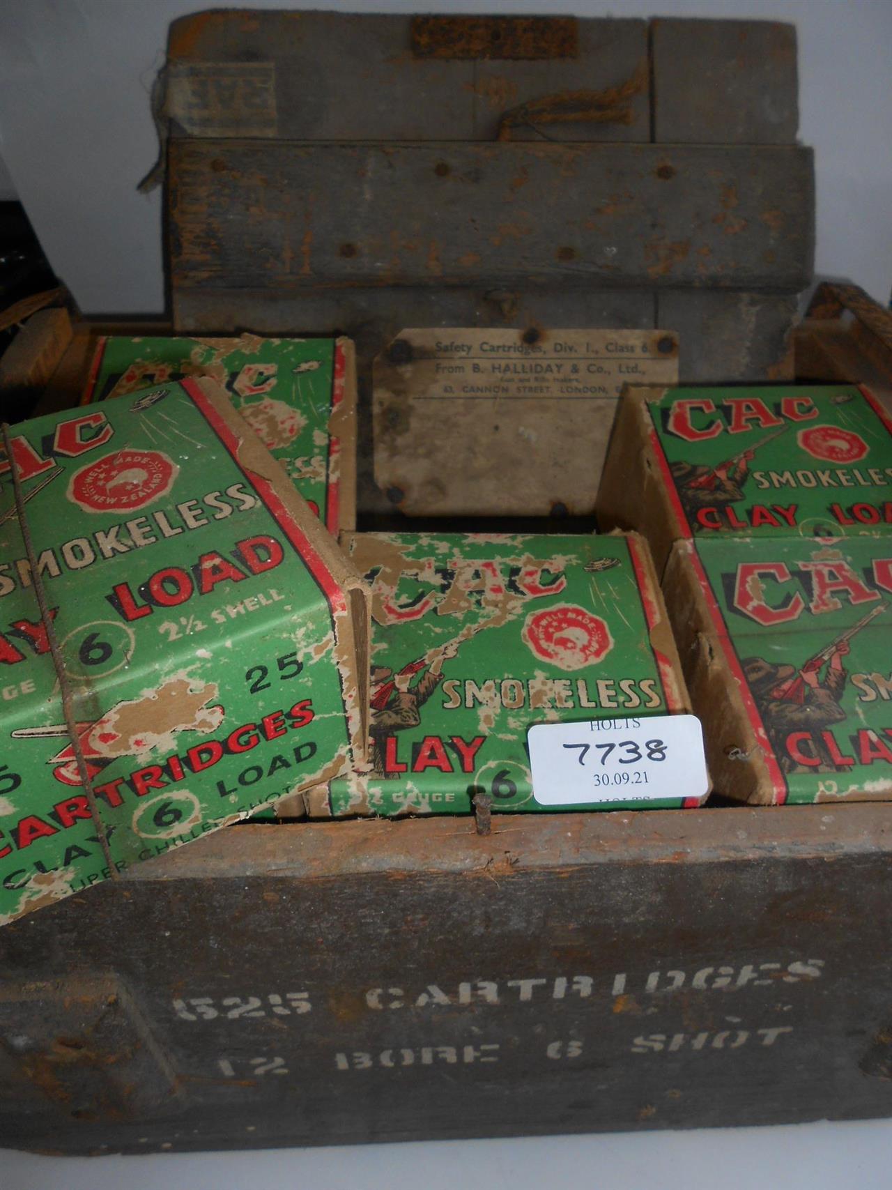 300 CAC 12 BORE 2 1/2in. 6 SHOT SHOTGUN CARTRIDGES IN AN ORIGINAL WOODEN DELIVERY CRATE Please be advised that cartridges/ammunition, primers, primed cases, blanks and percussion caps cannot be sent to you by post or carrier. If you wish, you can book a collection at one of our regional valuation days, or collect from our offices at PE31 6HA in Norfolk