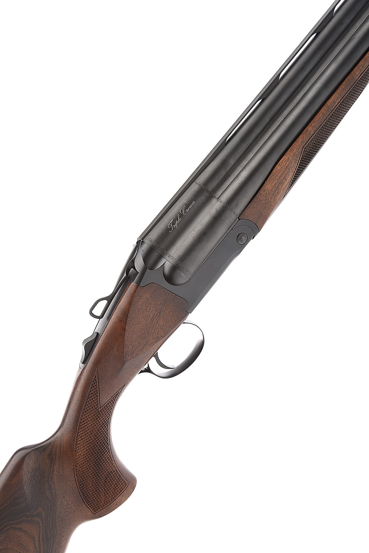 A VIRTUALLY NEW AND UNUSED AKKAR 12-BORE (3IN.) 'TRIPLE-CROWN' TRIPLE-BARRELLED SINGLE-TRIGGER TRIGGERPLATE-ACTION NON-EJECTOR, serial no. 17600110, circa 2017, 32in. superior proofed nitro barrels with 6mm ventilated matt top-rib, 3in. chambers, multichoke (with spares), manual safety, plain blacked action, 14 1/4in. pistolgrip stock including rubber recoil pad, beavertail fore-end, weight 9lb. 4oz., in its makers universal ABS case with paperwork and cardboard outer