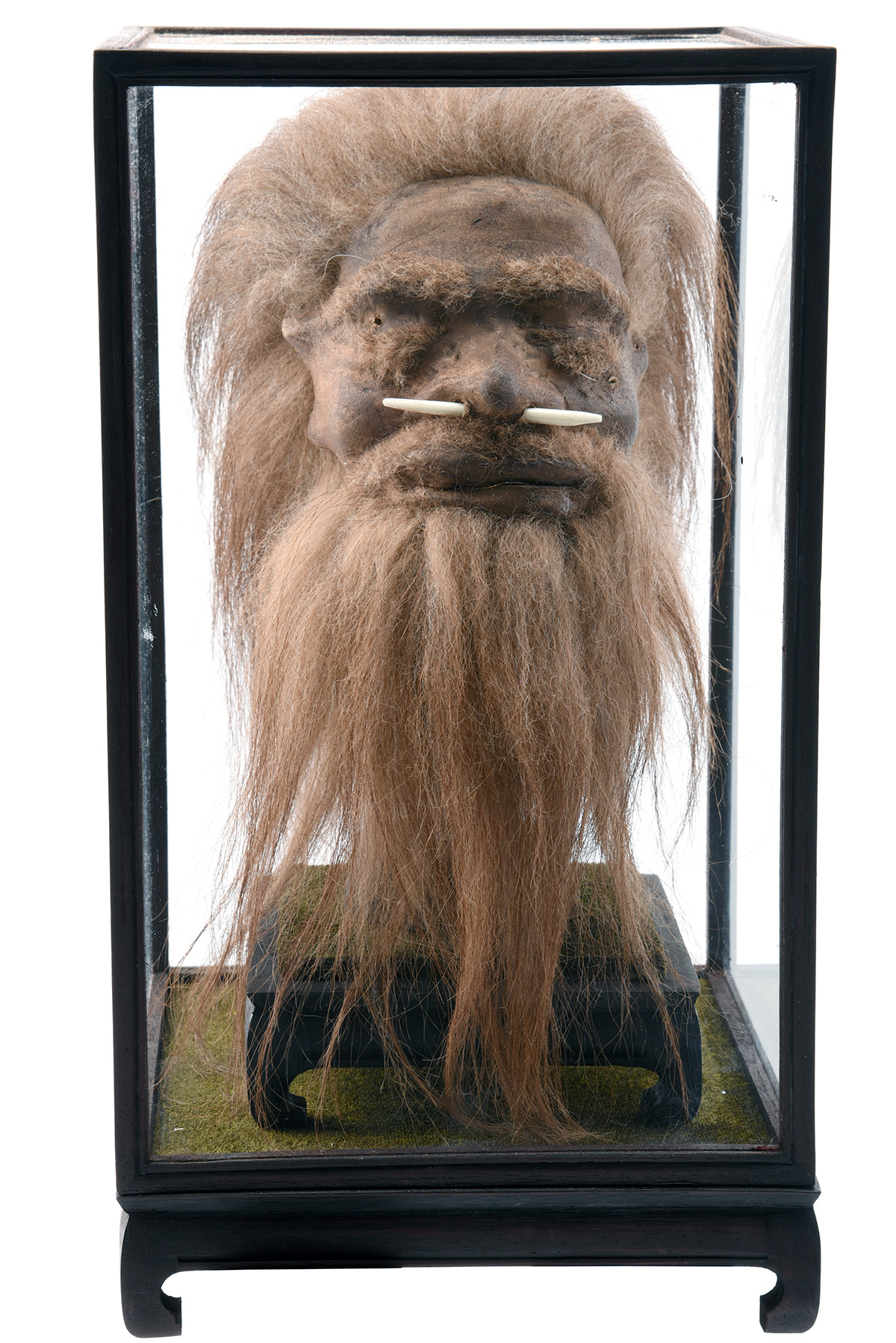 A CASED VINTAGE COPY OF A SHRUNKEN HEAD, with four sided glazed case,