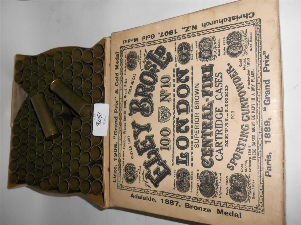 100 PRIMED 10 BORE 2 3/4in. PAPER CASES BY ELEY LONDON, ORIGINAL ELEY LONDON CARTON PRINTED WITH THEIR WIN AT PARIS IN 1889 Please note, that despite the printing on the top of the carton stating that the cases are metal lined and brown in colour, they are not, these are a dark greyish green colour and are not metal lined.