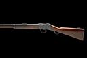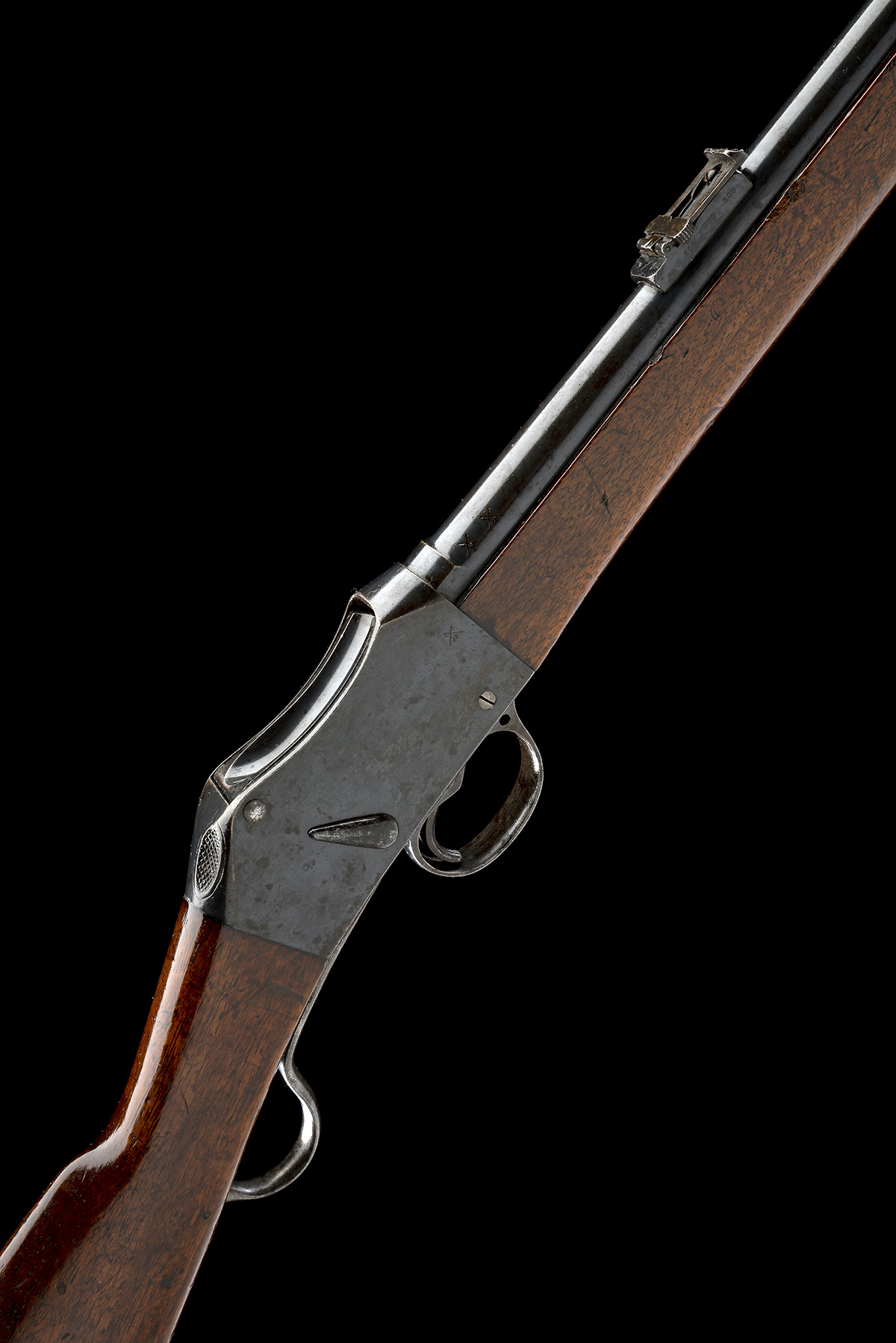 dated for 1879 and produced in Belgium, with 23in. blued barrel, blade fore-sight with side-protectors, elevating ladder rear-sight, slab-sided receiver, the left hand side stamped with a crowned circular garter trademark with 'WITTEN' and the date, plain walnut butt-stock with iron heel-plate and reinforced swivel mounted to the heel end of comb, full-length walnut fore-end with British Cavalry Carbine style iron nose-cap and button-tipped clearing rod, two iron barrel-bands, retaining much apparently original finish throughout
