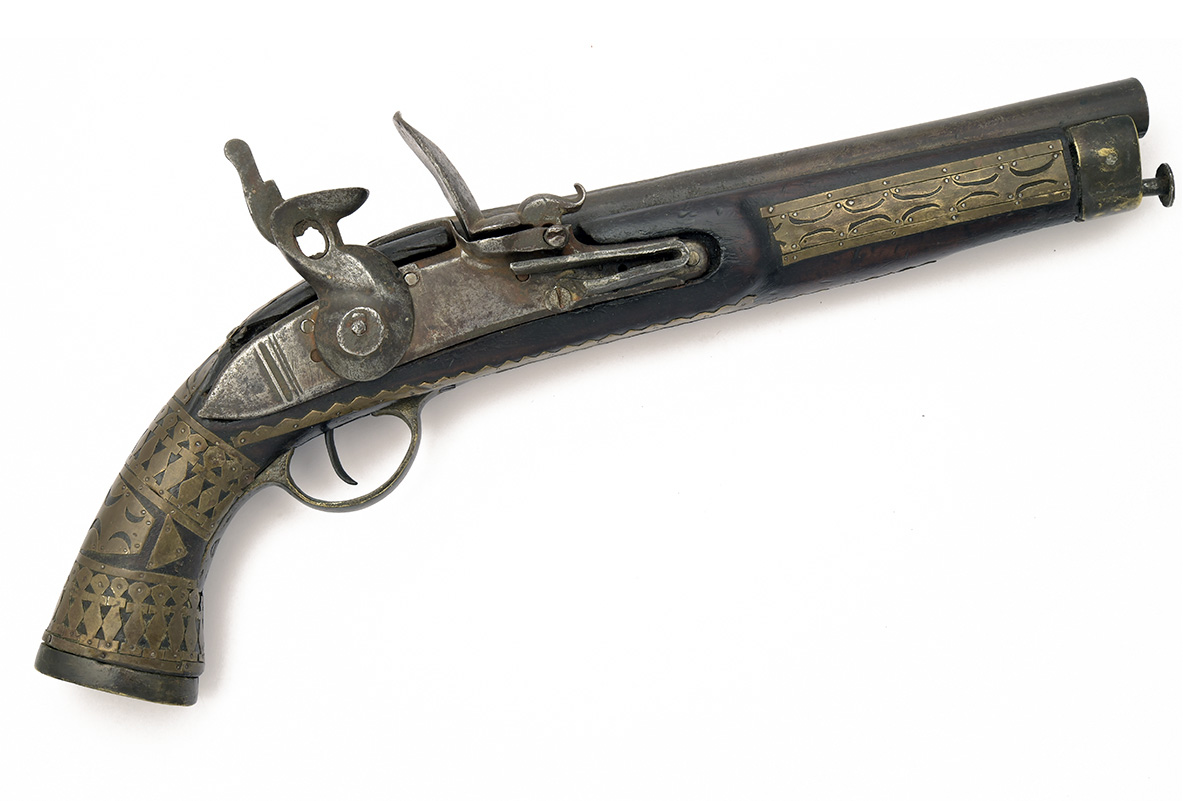 A .577 FLINTLOCK HORSE PISTOL WITH INDIAN DECORATION, UNSIGNED, no visible serial number, loosely copying the English Lancer's style, with 9 1/4in. barrel moulded with shallow flutes to the breech, reshaped military lock (top-jaw and screw missing), walnut full-stock and iron furniture, the wood covered in pierced brass geometric overlays