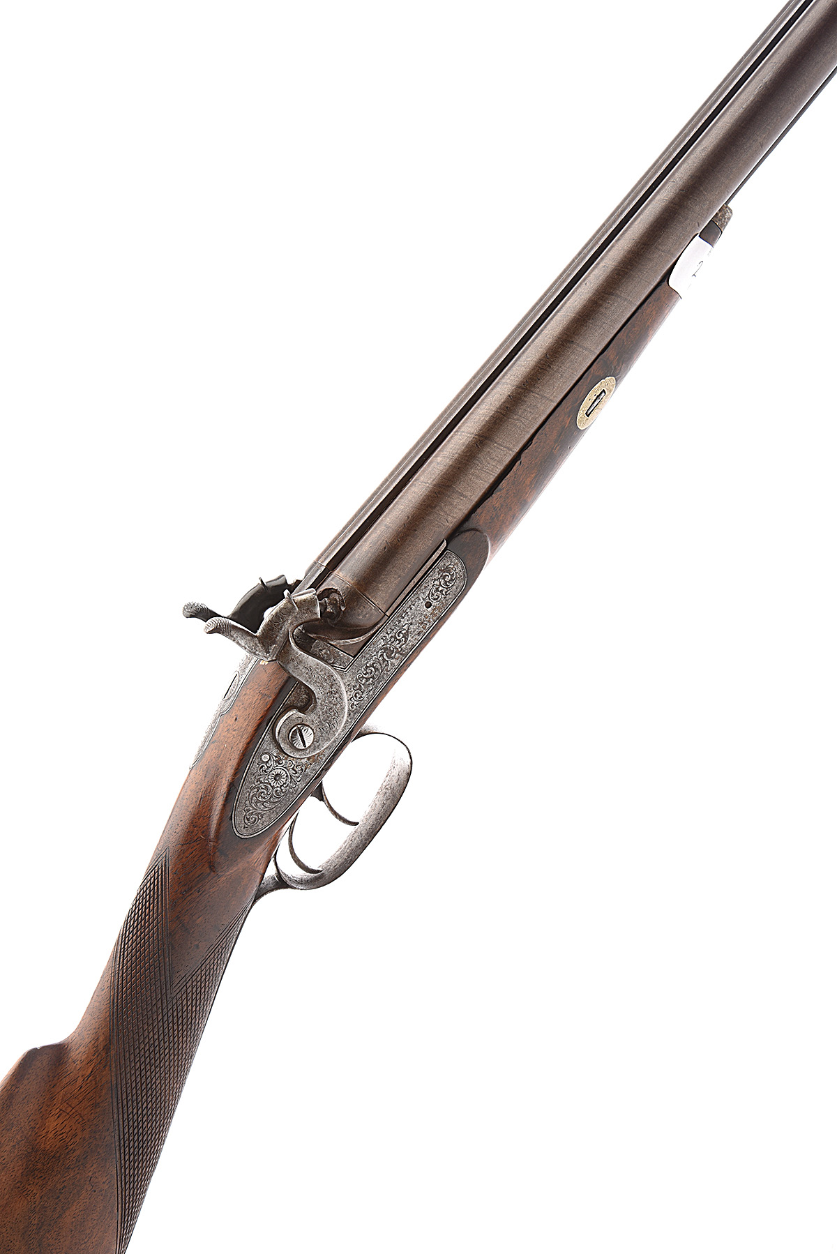 A 16-BORE PERCUSSION DOUBLE-BARRELLED SPORTING-GUN SIGNED BLISSETT, LIVERPOOL, no visible serial number, circa 1855, with re-browned twist 28in. barrels, 'LIVERPOOL' signature to top-rib, border and scroll engraved top-tang, borderline and scroll engraved bar-action locks signed 'BLISSETT' (left hammer replaced), walnut half-stock chequered at the wrist and iron furniture, complete with a replacement ramrod