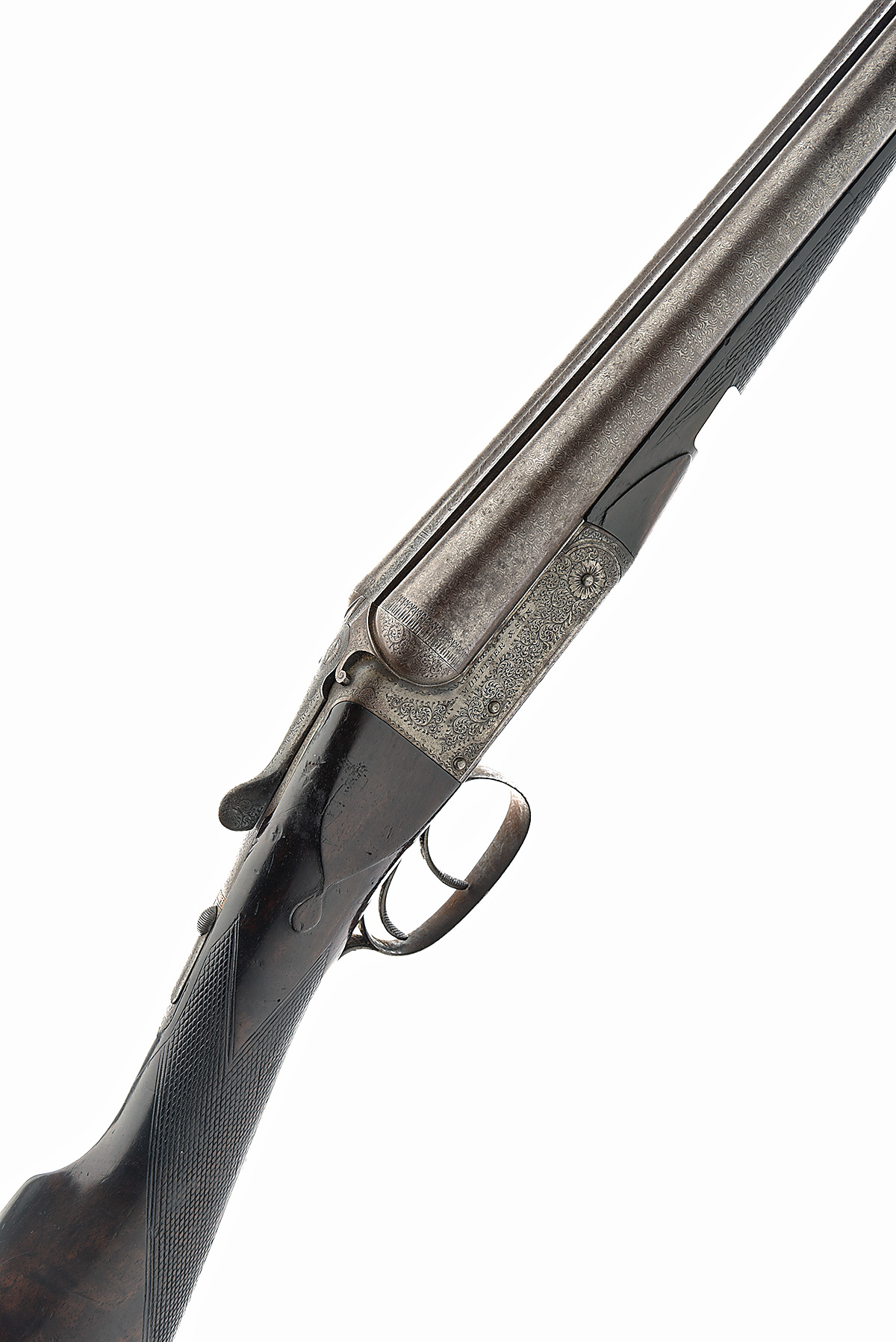 MORTIMER & SON 12-BORE BOXLOCK EJECTOR, serial no. 7619, circa 1900, 29in. nitro damascus barrels (some rust, pits and a bulge), the rib engraved 'MORTIMER & SON. 86 GEORGE ST. EDINBURGH', and '2' and with acanthus scroll detailing at the breech-end, 2 1/2in. chambers, bored approx. true cyl. and full choke, treble-grip action with carved fences, automatic safety with gold-inlaid 'SAFE' detail (safety at fault), border and acanthus scroll engraving, retaining very slight traces of colour-hardening and finish, 15in. figured stock including 1in. wooden extension, bolstered fore-end wood, weight 6lb. 11oz.