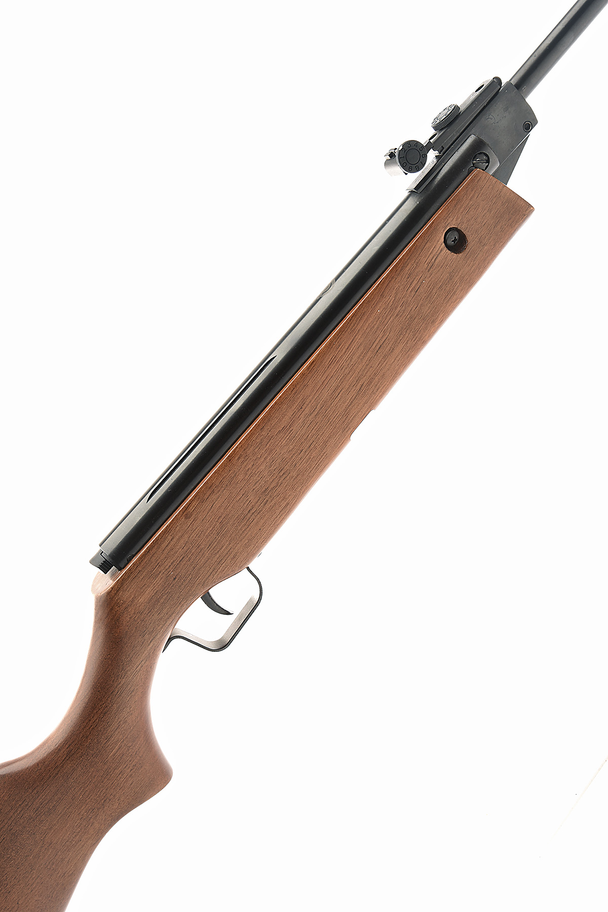 A .22 BREAK BARREL AIR RIFLE SIGNED SMK MODEL 12 Serial no 0400620, with a 16.5in. barrel, open sights, dovetail groove receiver for fitment of a telescopic sight, tang safety, in a Beech right hand stock.