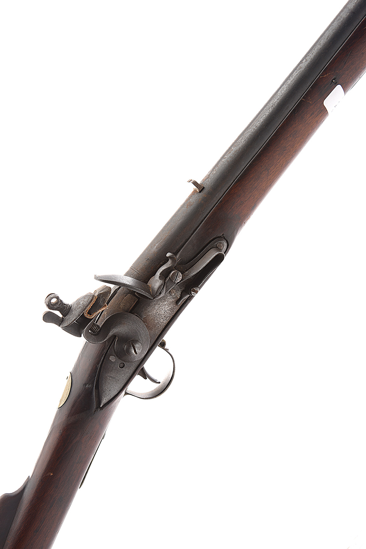 * A .750 FLINTLOCK MUSKET, UNSIGNED, MODEL 'BROWN BESS TYPE', serial no. WR216035, added later, the musket English and circa 1800, with shortened 34 1/2in. sighted barrel, plain military style lock scrubbed of details (mainspring at fault), walnut hand-rail full-stock (remodelled in places) and brass furniture, ramrod later replacement