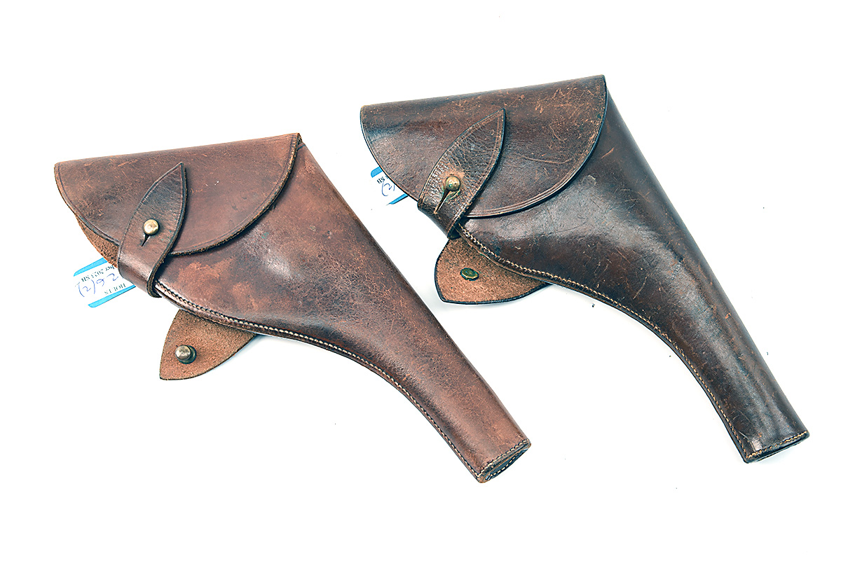 * A GOOD PAIR OF WORLD WAR I WEBLEY REVOLVER HOLSTERS, one dated 1913, maker-marked on the belt-loop 'HOBSON & SONS / 1913 / LONDON', the other marked 'CXA', service worn with tight stitching