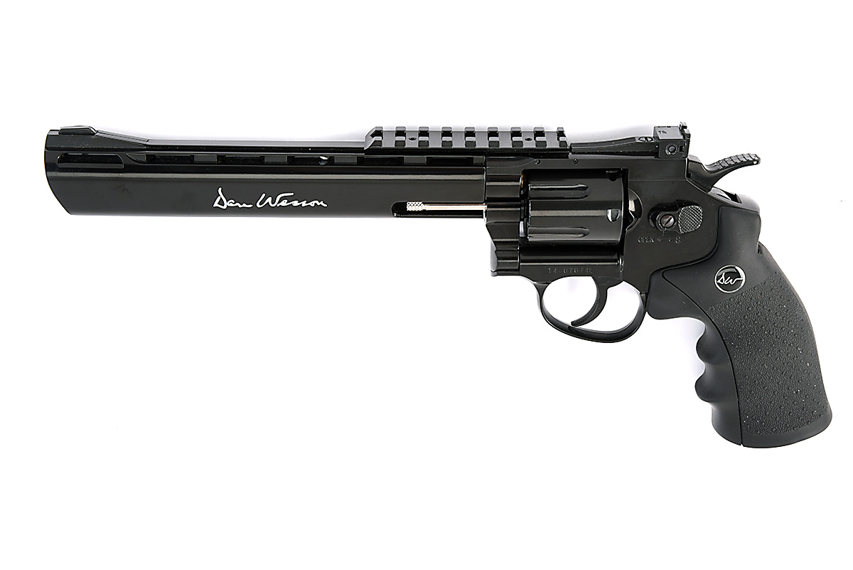 A BOXED .177 CO2 POWERED AIR PISTOL SIGNED DAN WESSON serial no. 14J07074 with an 8in. barrel open sights picatinny rail for fitment of a telescopic sight red/green dot sight with brightness settings black gloss frame and barrel with black plastic grips. Not tested.