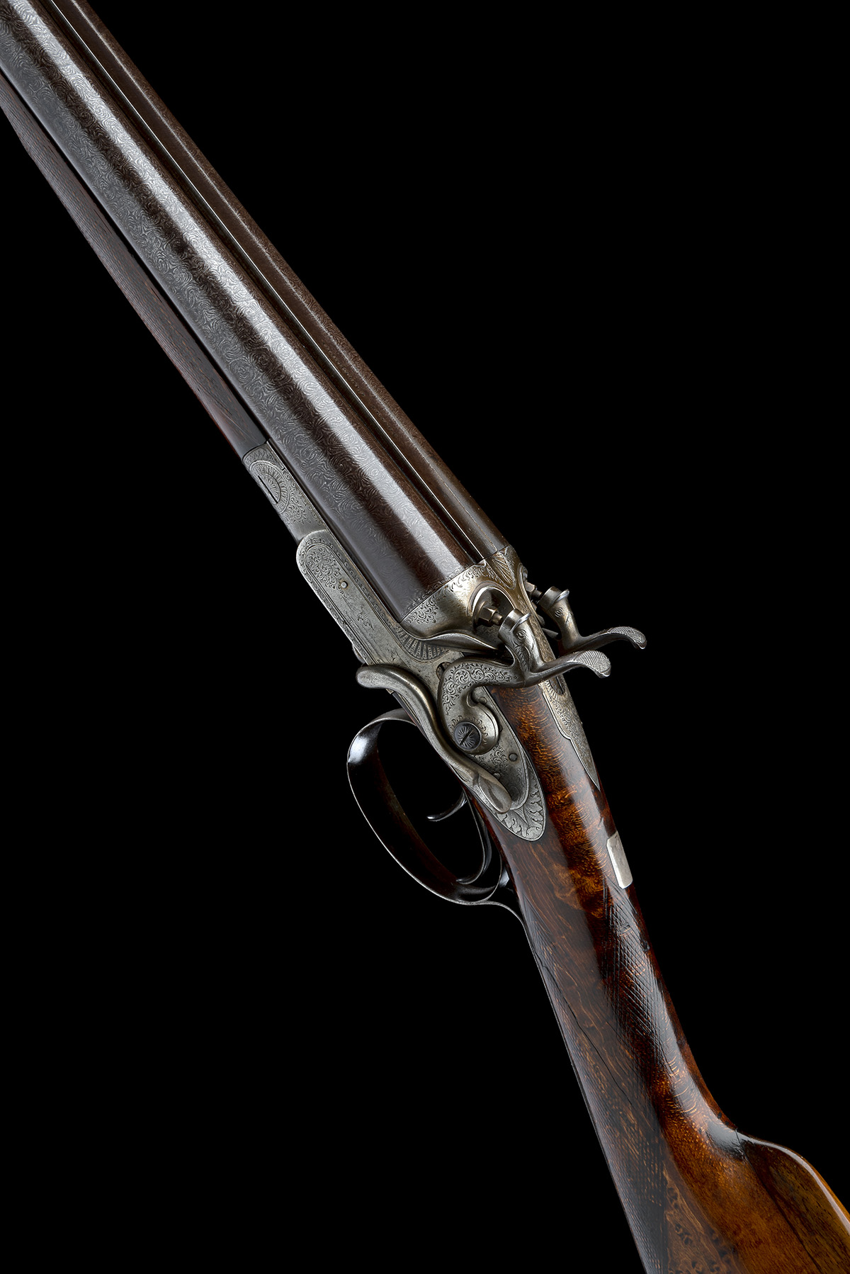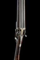 ADSETT 12-BORE (CONVERTED) SIDELEVER HAMMERGUN, serial no. 2050, circa 1870, 27 1/8in. black powder only bold damascus barrels, rib engraved 'ADSETT. CANTERBURY', 2 1/2in. chambers, bored approx. true cyl in both, heavily pitted, wall thicknesses at 17 and 19, converted from muzzle-loading, carved percussion fences, rebounding sidelocks with stepped tails and dolphin hammers, the action flats marked 'J. ADSETT CANTERBURY' and 'CONVERTED', acanthus scroll engraving surrounding game scene vignettes of hound and fowl, the bowed triggerguard with a lion and hound, 14 1/4in. birdseye walnut stock cracked at hand and with a comb insert, including 1/4in. wooden extension and with steel buttplate (tang springing), fore-end wood with crack, weight 6lb. 13oz.