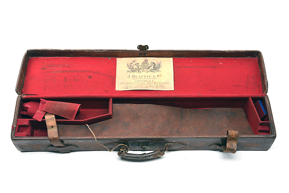 A LEATHER SINGLE GUNCASE, fitted for 30in. barrels, the interior lined with maroon baize, a J. Beattie & Co. trade label, brass lock (key missing)