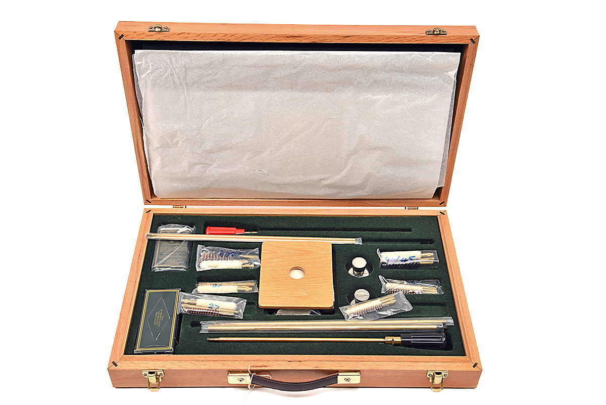 LIGHTWOOD & SON 'SAFARI' SIX CALIBRE SOLID AMERICAN UNUSED OAK RIFLE CLEANING KIT, to include, large calibre, brass, 3-part Parker Hale cleaning rod; small calibre, brass, 3-part Parker Hale cleaning rod, 2 x nickel plated round oil flasks; box of 25 4x2 patches; 125ml Rangoon oil; accessory compartment with more patches and cloth: six complete 3 brush sets in calibres .22, .24, .27, .30, .45 & .600;
